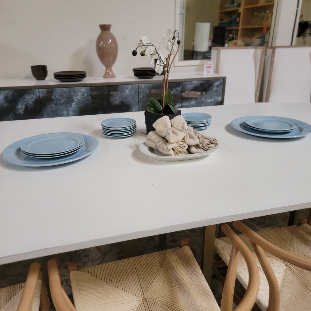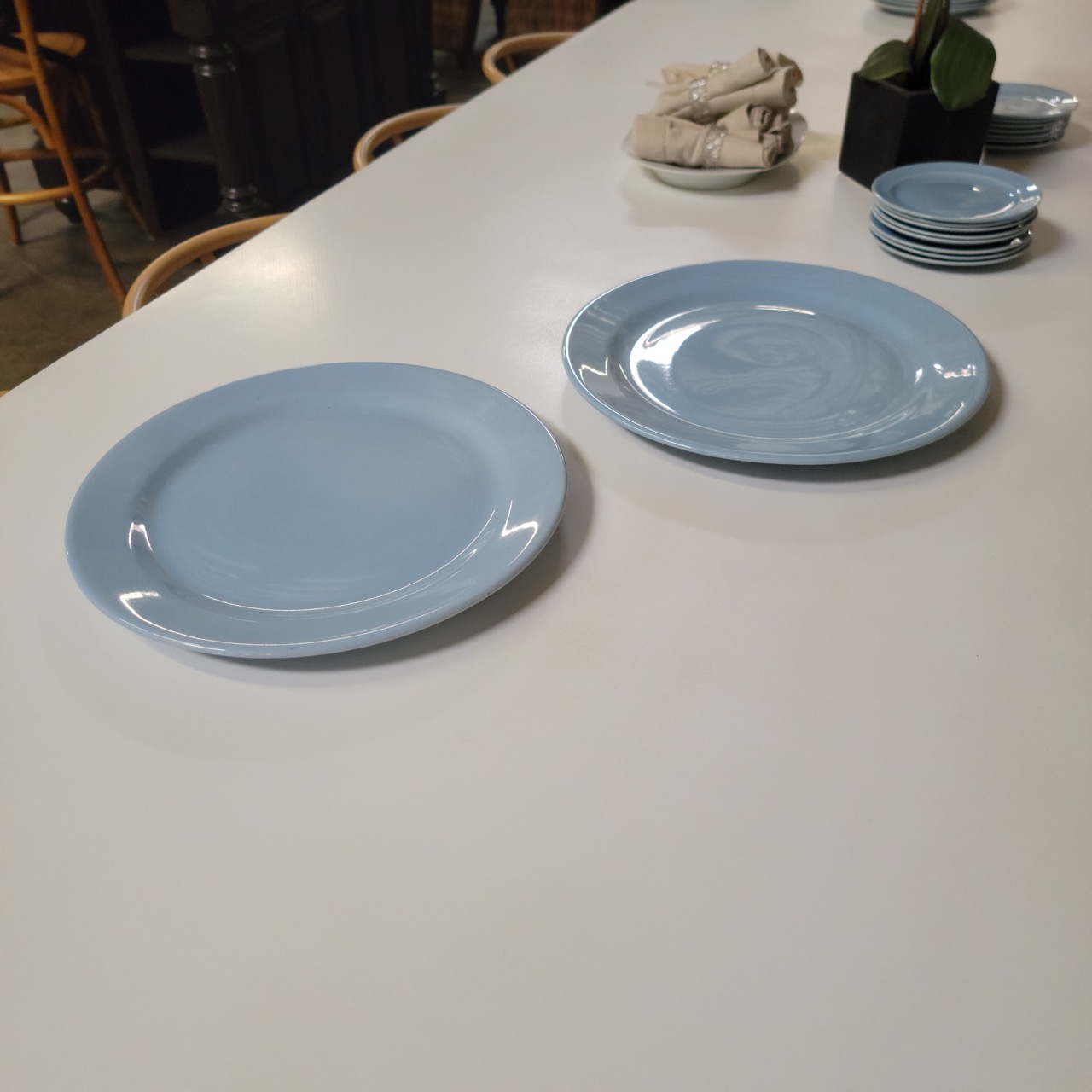 A soft wash of powder blue with that unmistakable mid-century glow. These Lu-Ray Pastels chop plates bring quiet color to the center of the table without overpowering it.