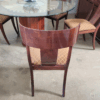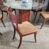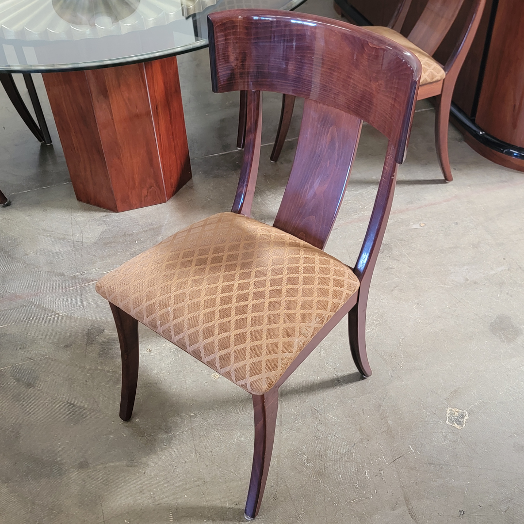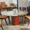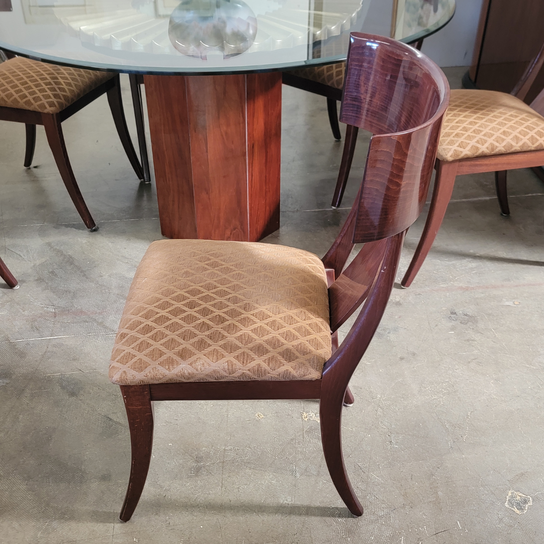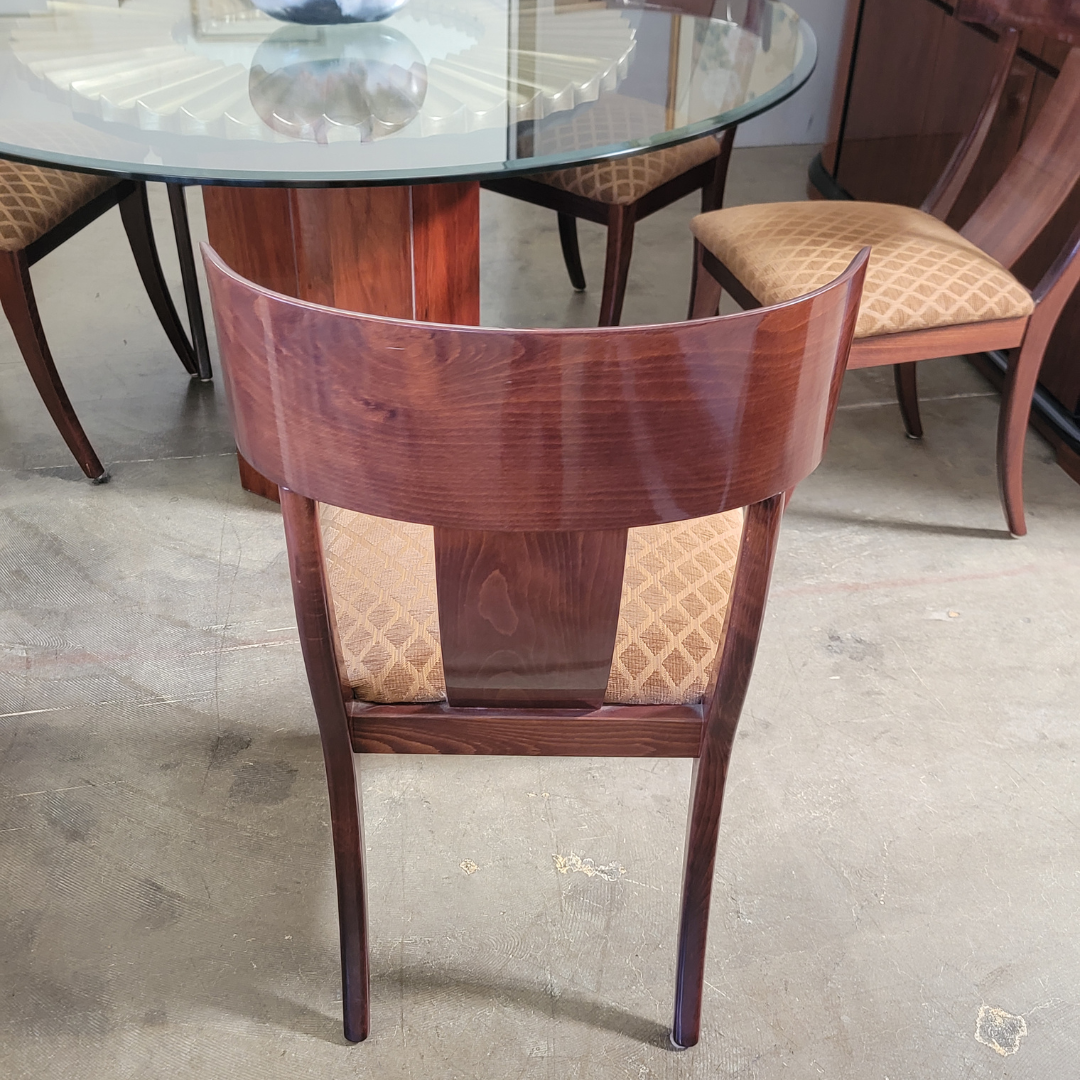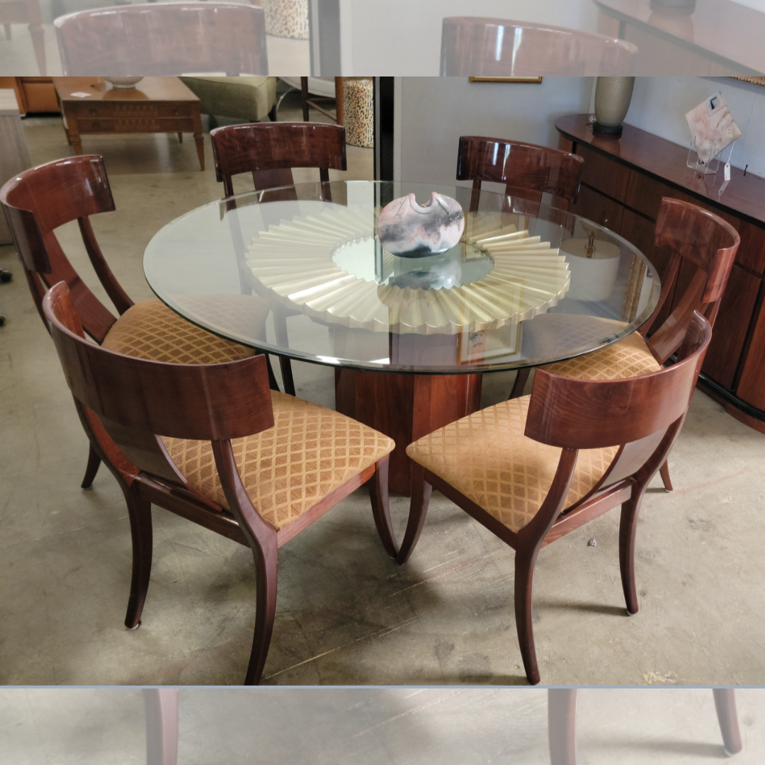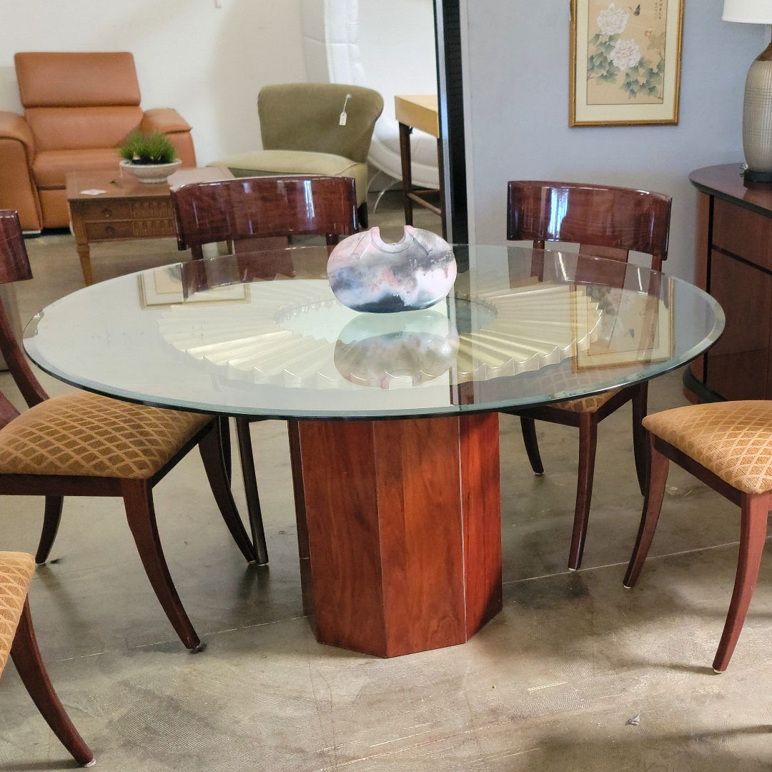 This complete Art Deco Revival dining set pairs a 60 inch round glass dining table with a dramatic hexagonal African walnut pedestal and six Hollywood Regency dining chairs. The beveled glass top keeps the room open and bright, while the warm walnut pedestal brings vintage luxury. Chairs feature curved walnut backs and diamond-pattern upholstered seats for comfort and posture that suits long dinners. The set reads classic and modern at once, easy to style with sculpted lighting, brass accents, or neutral rugs.