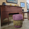 A high-impact accent piece from Arteriors, the Twyla ottoman combines a modern drum silhouette with a dramatic skirt of antique-tone chain fringe. The burgundy chenille upholstery adds warmth and depth, while the fringe brings texture, movement, and a hint of vintage lounge glamour. In person, the piece reads like furniture and sculpture at the same time, the kind of detail that makes a room feel designed.