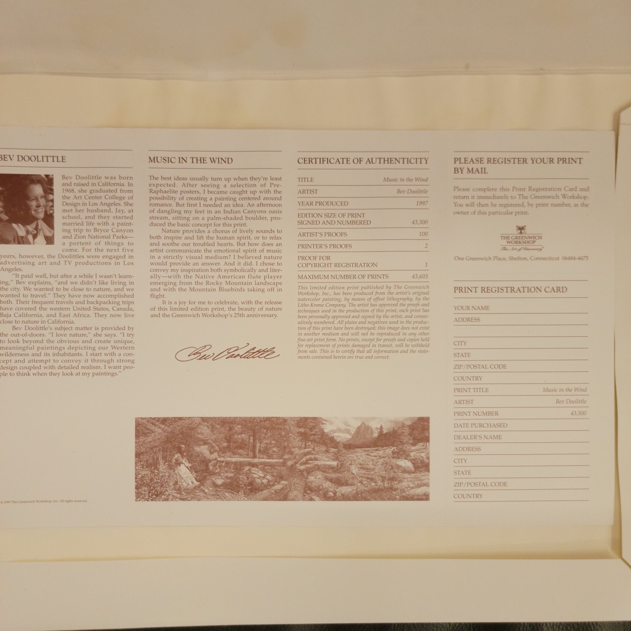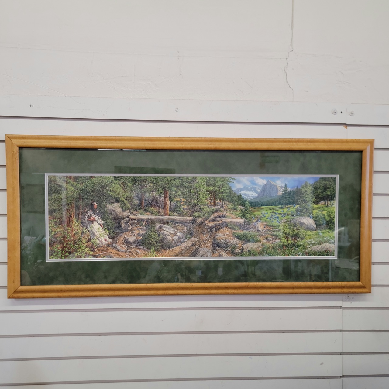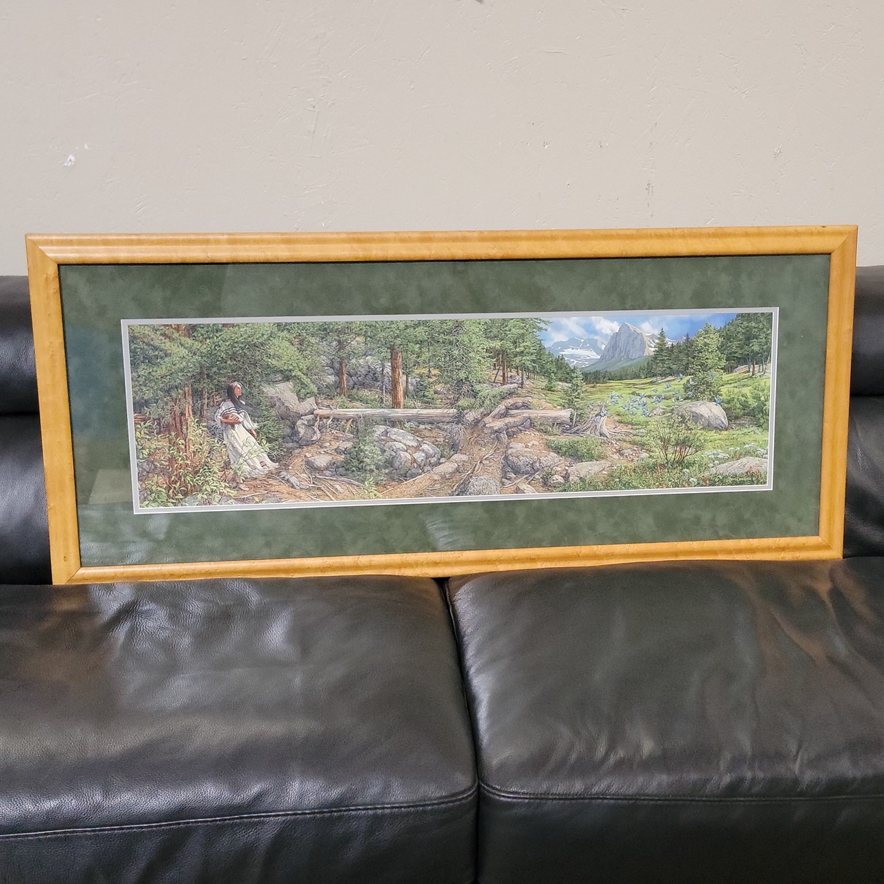 “Music in the Wind” by Bev Doolittle captures a Rocky Mountain scene layered with hidden detail, from the lone figure to the subtle movement across the field. The panoramic format stretches the composition wide, giving it presence without overwhelming a wall. Set in a warm wood frame with deep green matting that pulls the landscape forward.