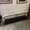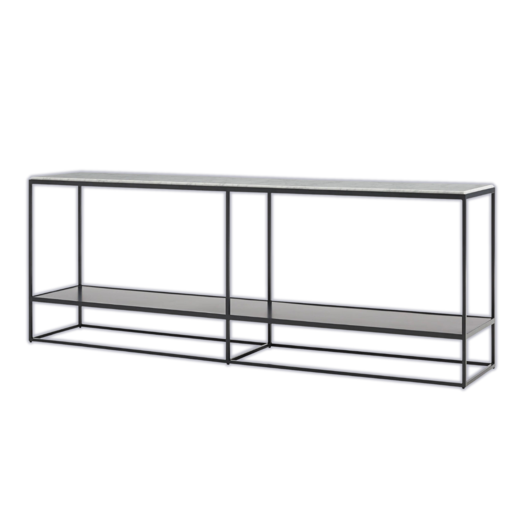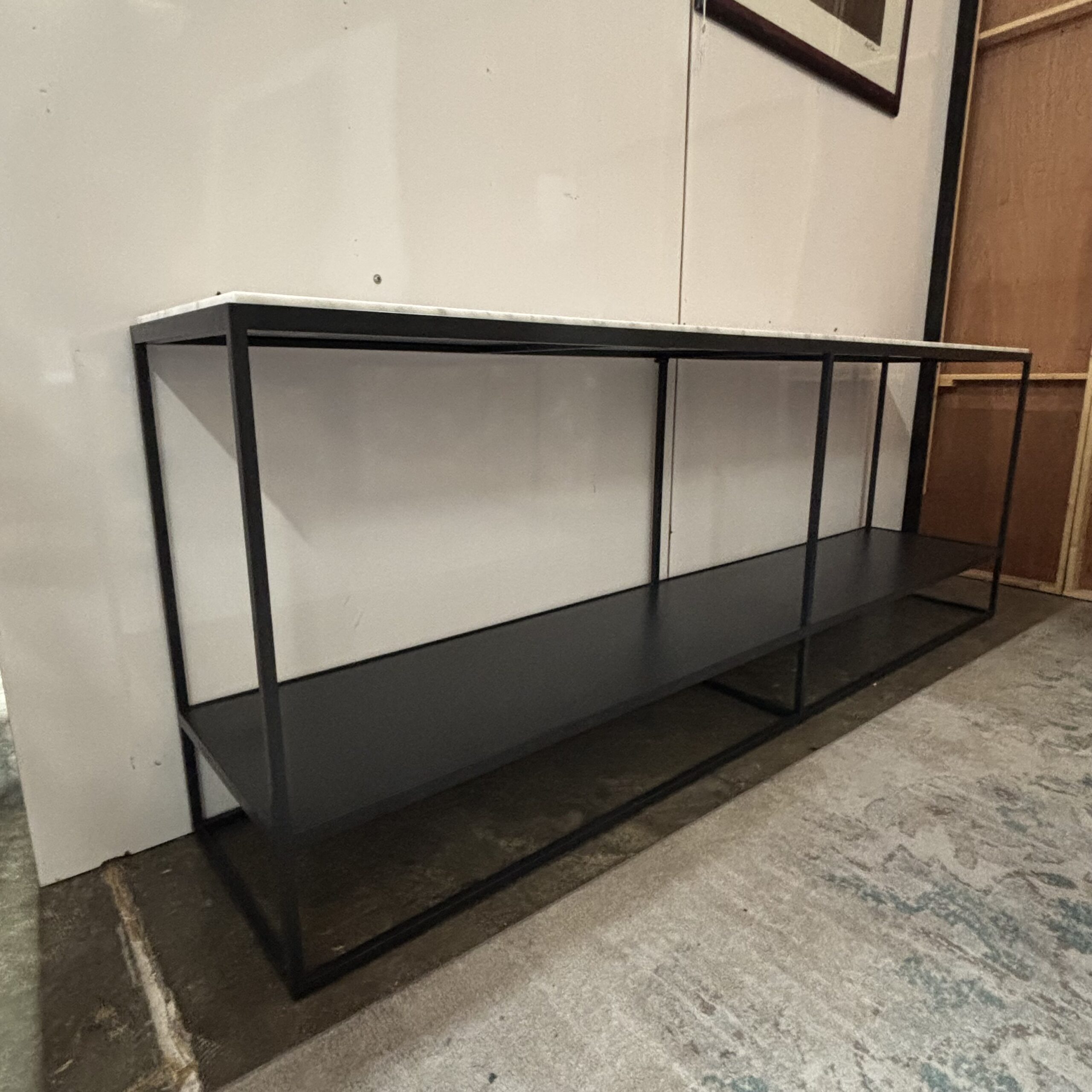 The Blu Dot Construct Console brings modern order with its clean geometry and luxe material mix. A Carrara marble slab rests on a sturdy powder-coated steel frame, balanced by a full-length lower shelf for books, objects, or display pieces. At 72″W x 14″D x 26″H, it’s slim enough for hallways or behind a sofa, yet substantial enough to anchor a living or dining room.