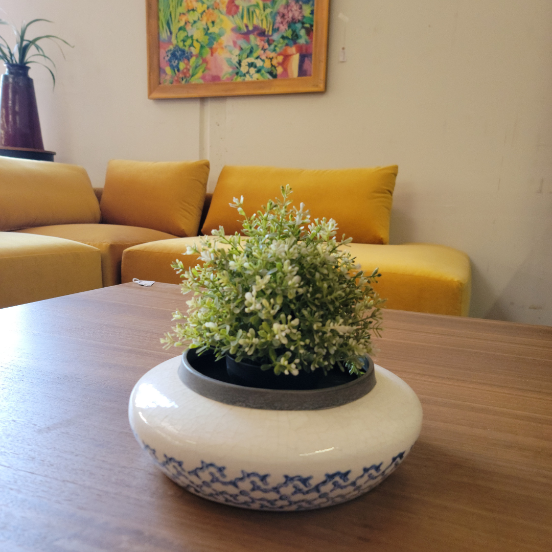 Perfect for tabletop greenery, faux arrangements, or as a decorative accent on consoles, shelves, or coffee tables. The neutral white with blue detailing complements a range of interiors, from classic and coastal to eclectic and contemporary.