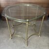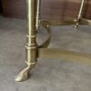 The beveled glass top softens the geometry while allowing the base to remain visually open. The brass frame features turned legs, curved stretchers, and small foot details that give the piece its Regency character without excess shine. The scale is generous enough to function comfortably beside seating, yet open enough to avoid visual weight.