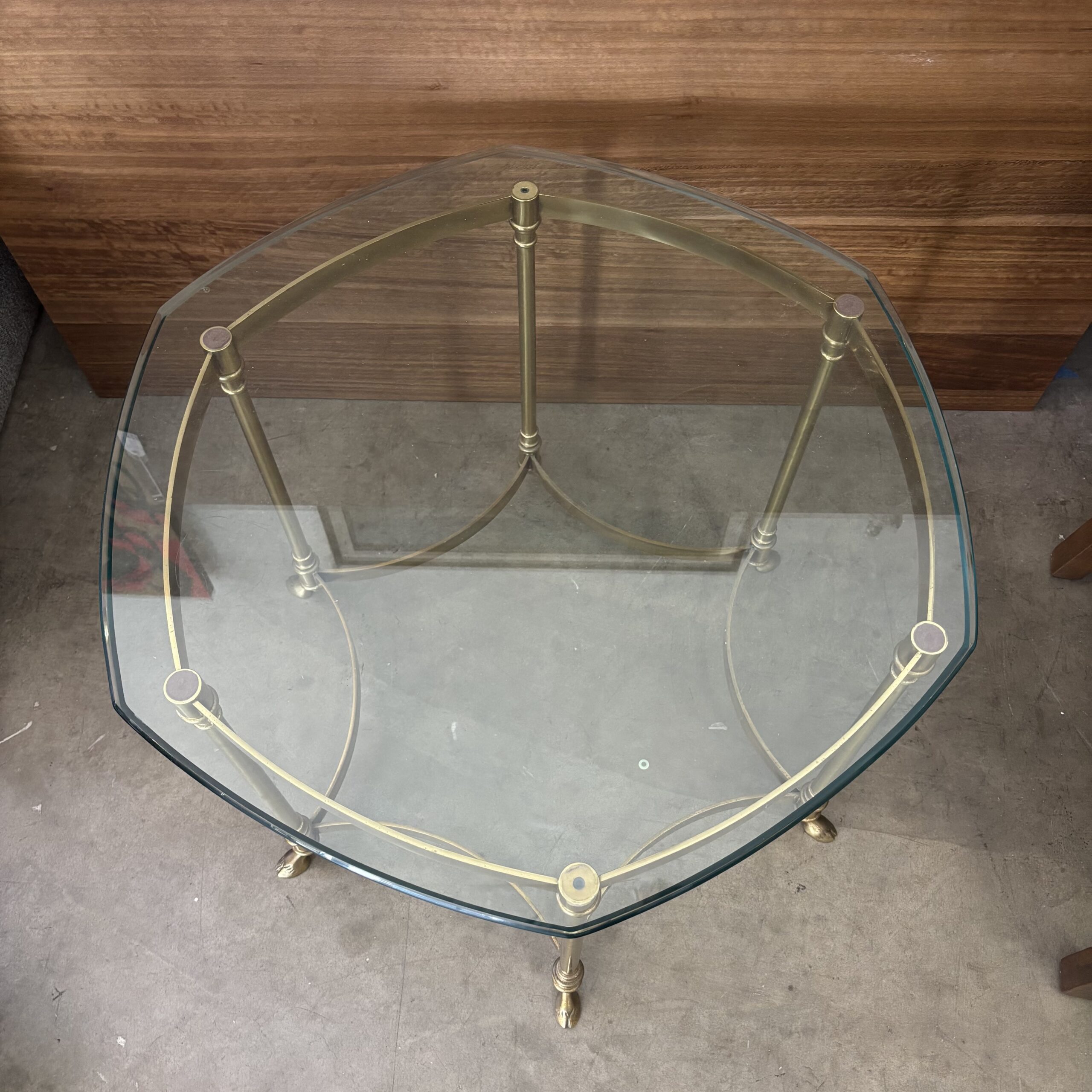 This side table carries a light, elegant presence, a beveled glass surface floating above a finely detailed brass frame that feels composed rather than ornate.