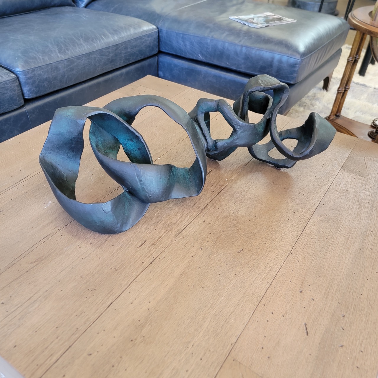 This is a “quiet flex” décor piece. A continuous ribbon-like form in metal, looping and folding into an abstract sculpture that looks different from every angle. The finish reads matte charcoal with moody blue-green undertones, which makes it feel collected and gallery-adjacent, not shiny or trendy.