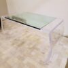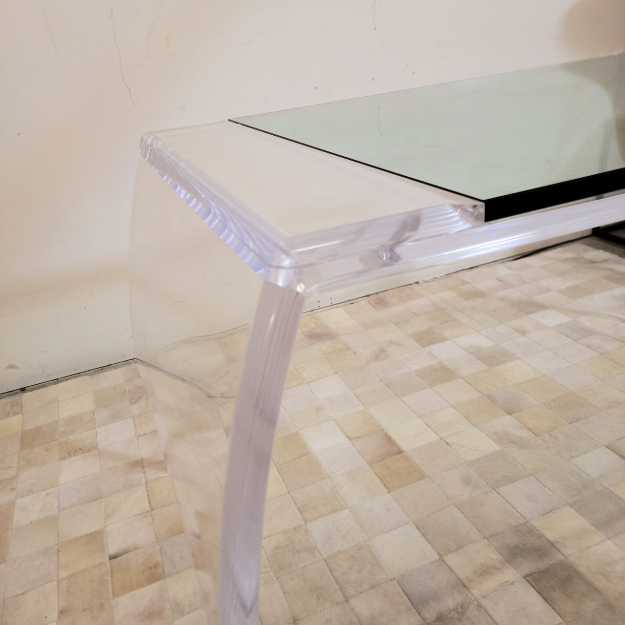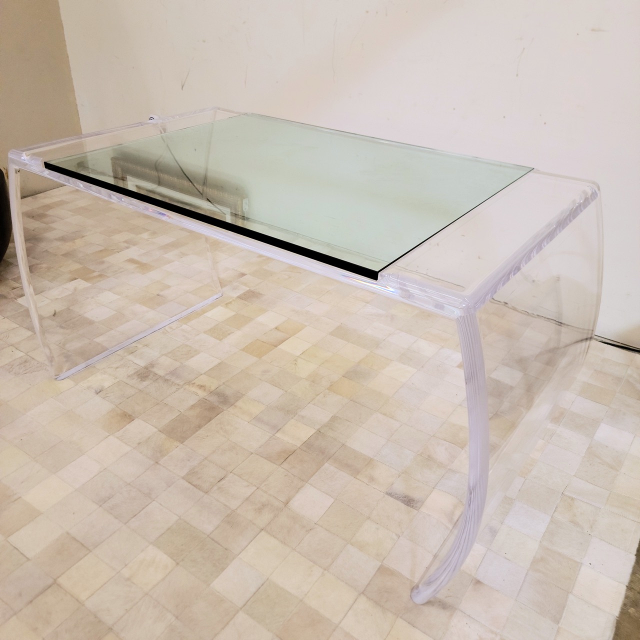 The shape is the story here. The continuous acrylic form curves down into broad legs, which gives the desk a softer silhouette than a sharper waterfall profile. It feels modern, airy, and easy to place without weighing down the room.