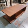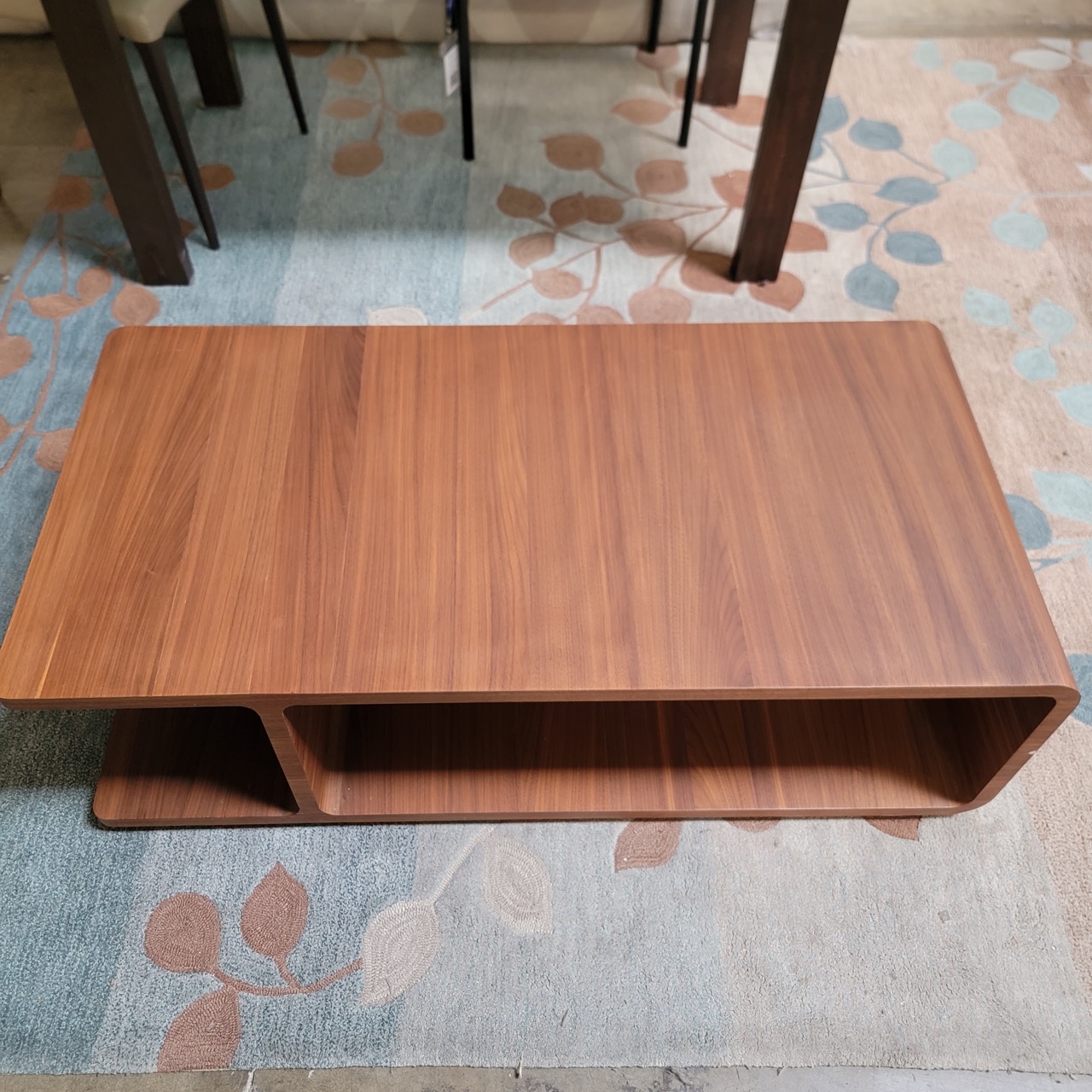 At just under 3.5 feet wide, it is well scaled for use in front of a sofa or sectional and sits low for a relaxed, contemporary profile. The two open compartments are ideal for stashing magazines, remotes, or display pieces while maintaining easy access.
