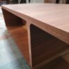 The design features a gently curved, waterfall-like silhouette with rounded corners and an open shelf base divided into two compartments, creating a balanced look while adding practical storage below the top. Its broad surface offers plenty of room for books, trays, or décor, while the lower openings help keep a space feeling organized and uncluttered.