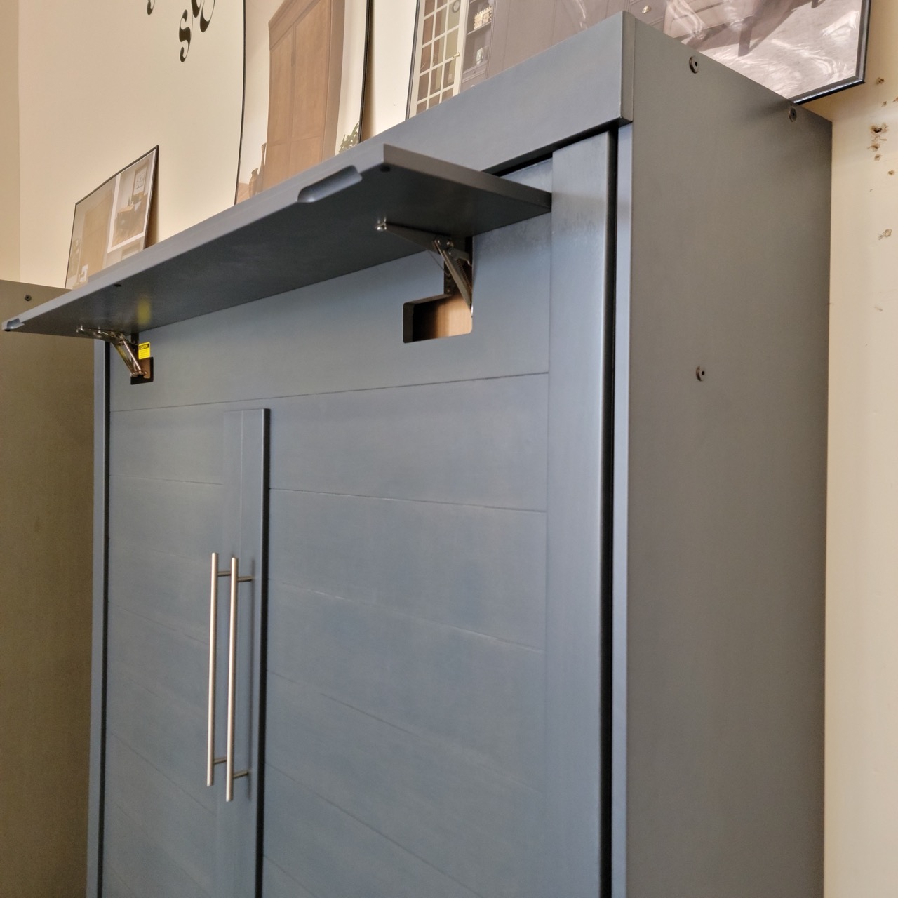 The Dublin wallbed brings a refined, modern aesthetic with horizontal plank detailing that adds warmth and architectural texture. In Bark Gray, this floor model shows a deeper, more saturated interpretation of the finish, reading slightly blue with a softer grain presence due to the heavier finishing coat. It pairs well with contemporary spaces, coastal palettes, and minimalist rooms that benefit from a clean, structured focal point.