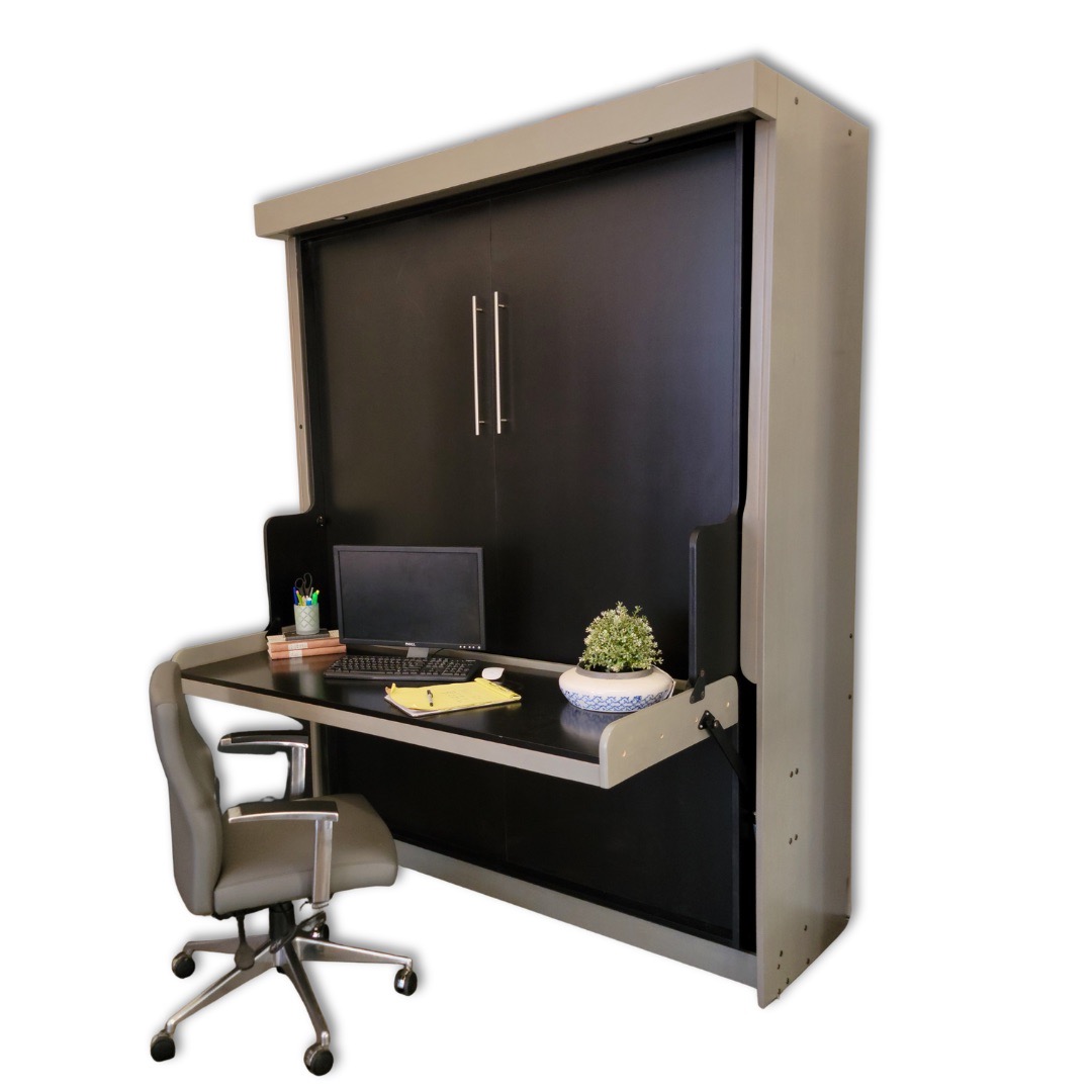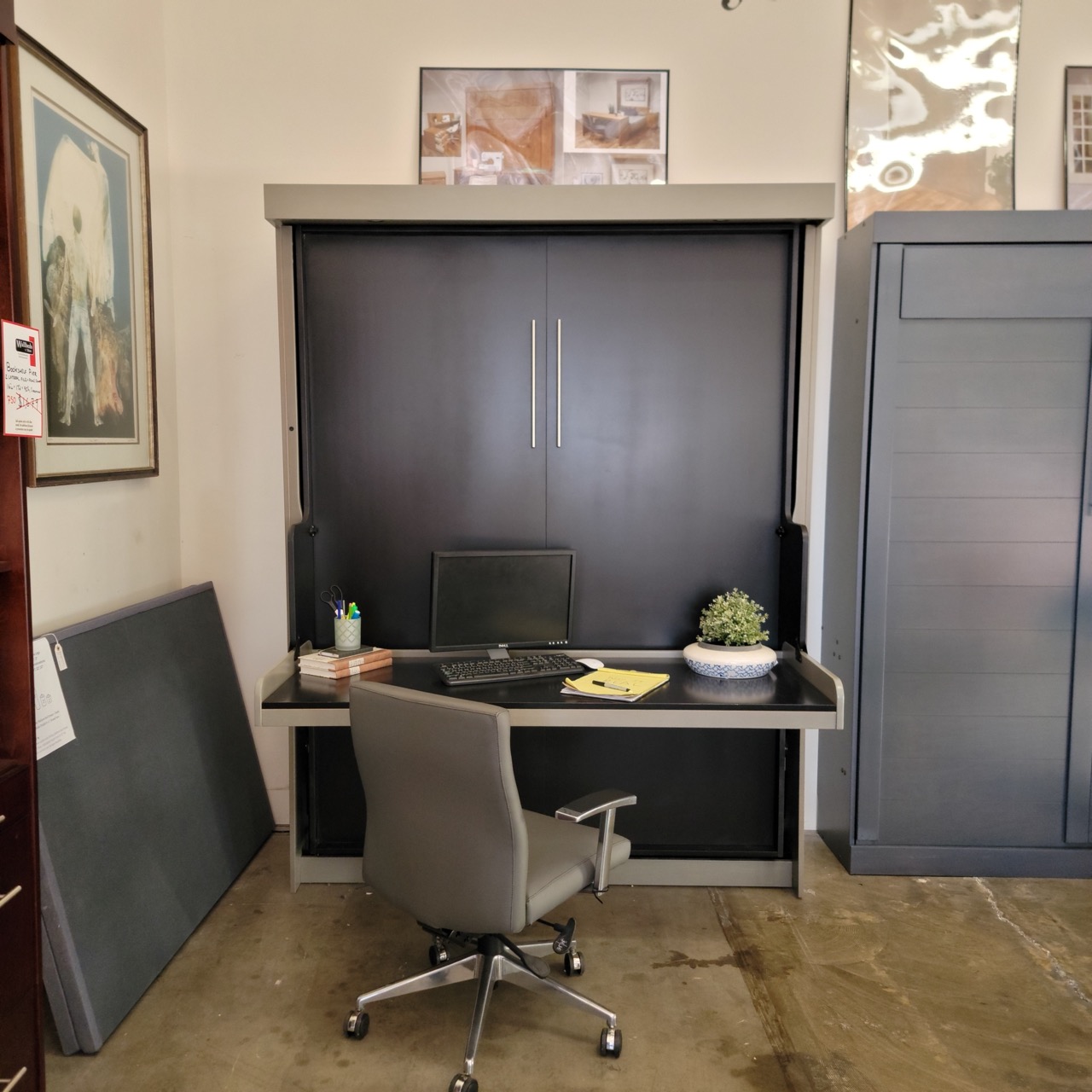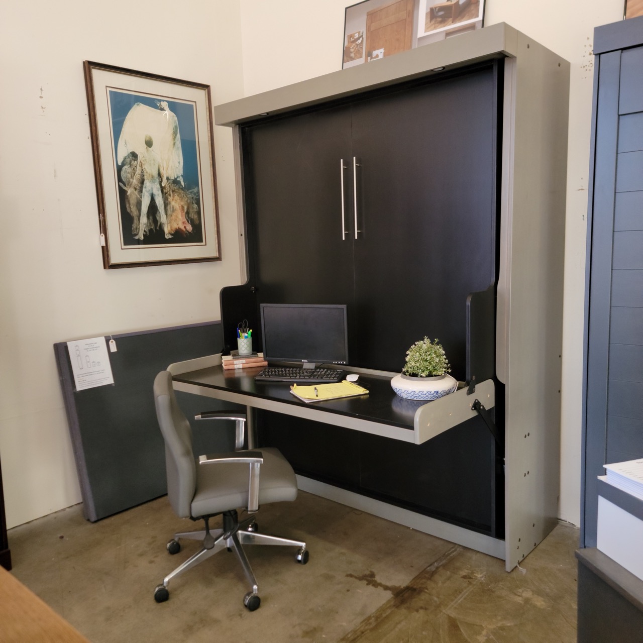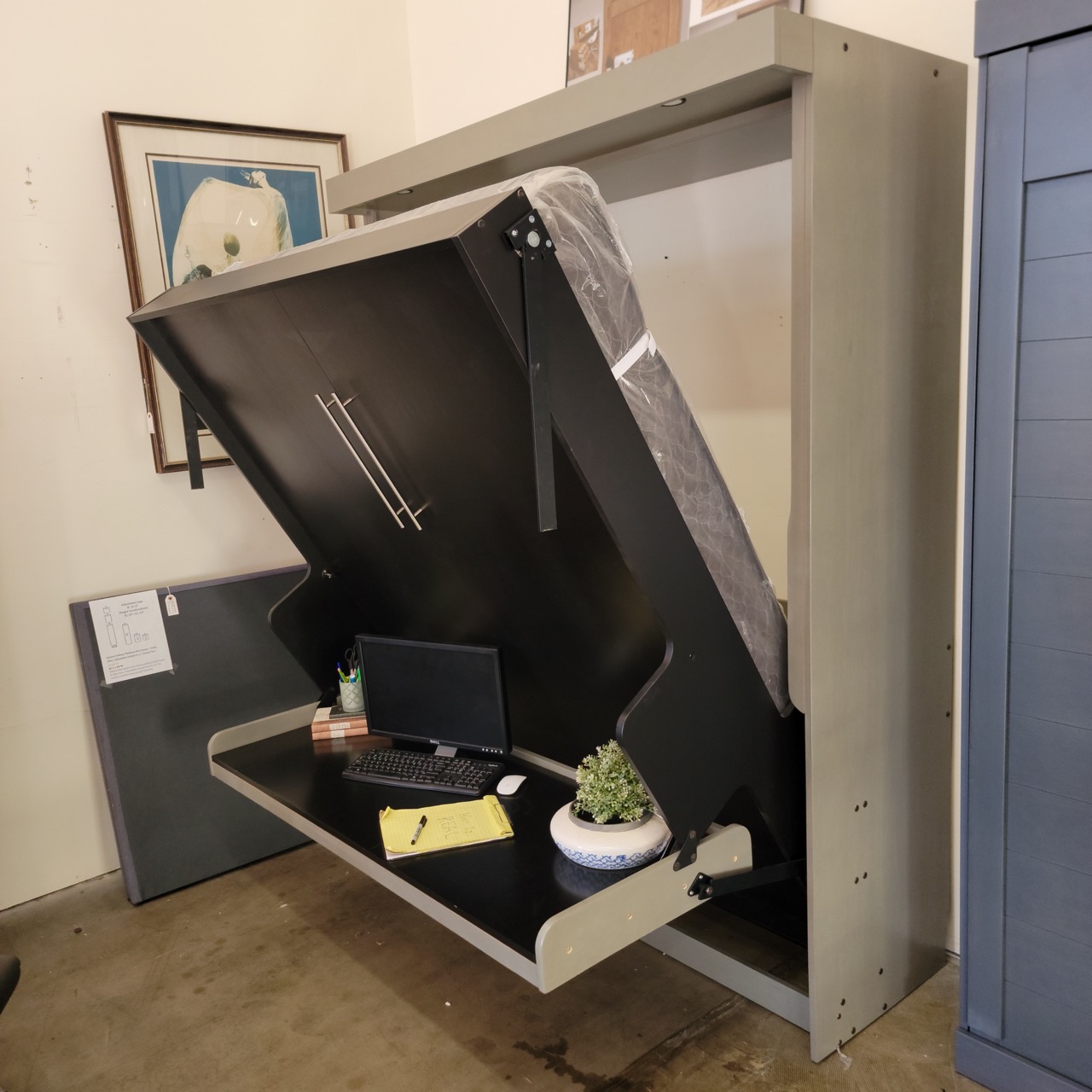 The Euro Vertical Desk Bed brings together a clean modern profile, a full-time workstation, and a space-saving Murphy bed mechanism that allows your desk items to remain in place when lowering the bed. This Queen-size floor model is a custom one-of-a-kind variant, built in Pebble Gray with a Midnight Black tabletop and front panel not normally offered in the standard finish lineup.