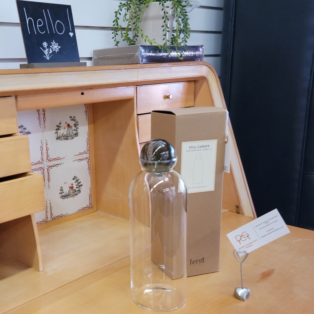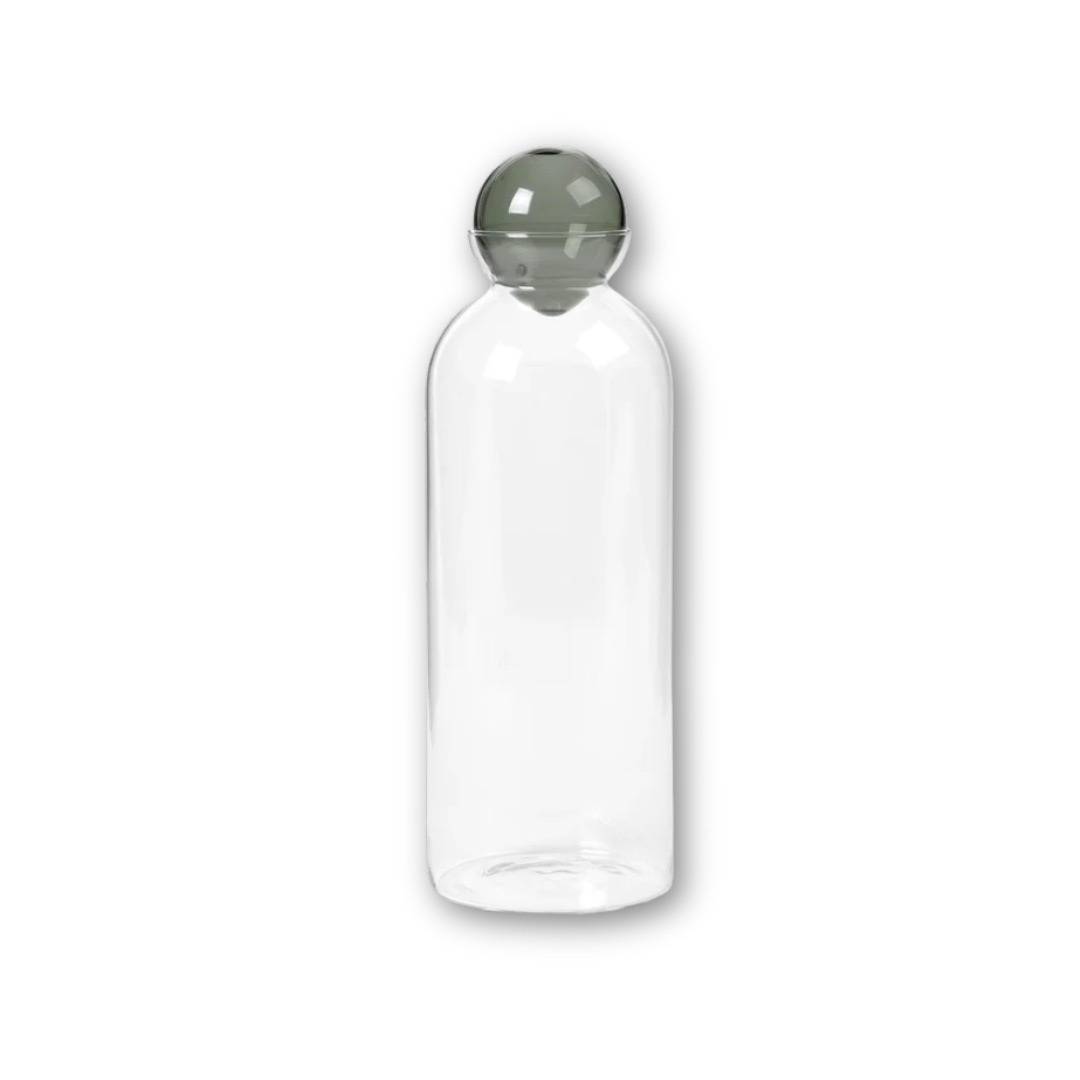 Minimalist mouth-blown glass carafe with sphere-shaped colored glass stopper • Dishwasher safe, easy daily use • Style it on the dining table, bar cart, bedside, or bathroom shelf. Only One available.