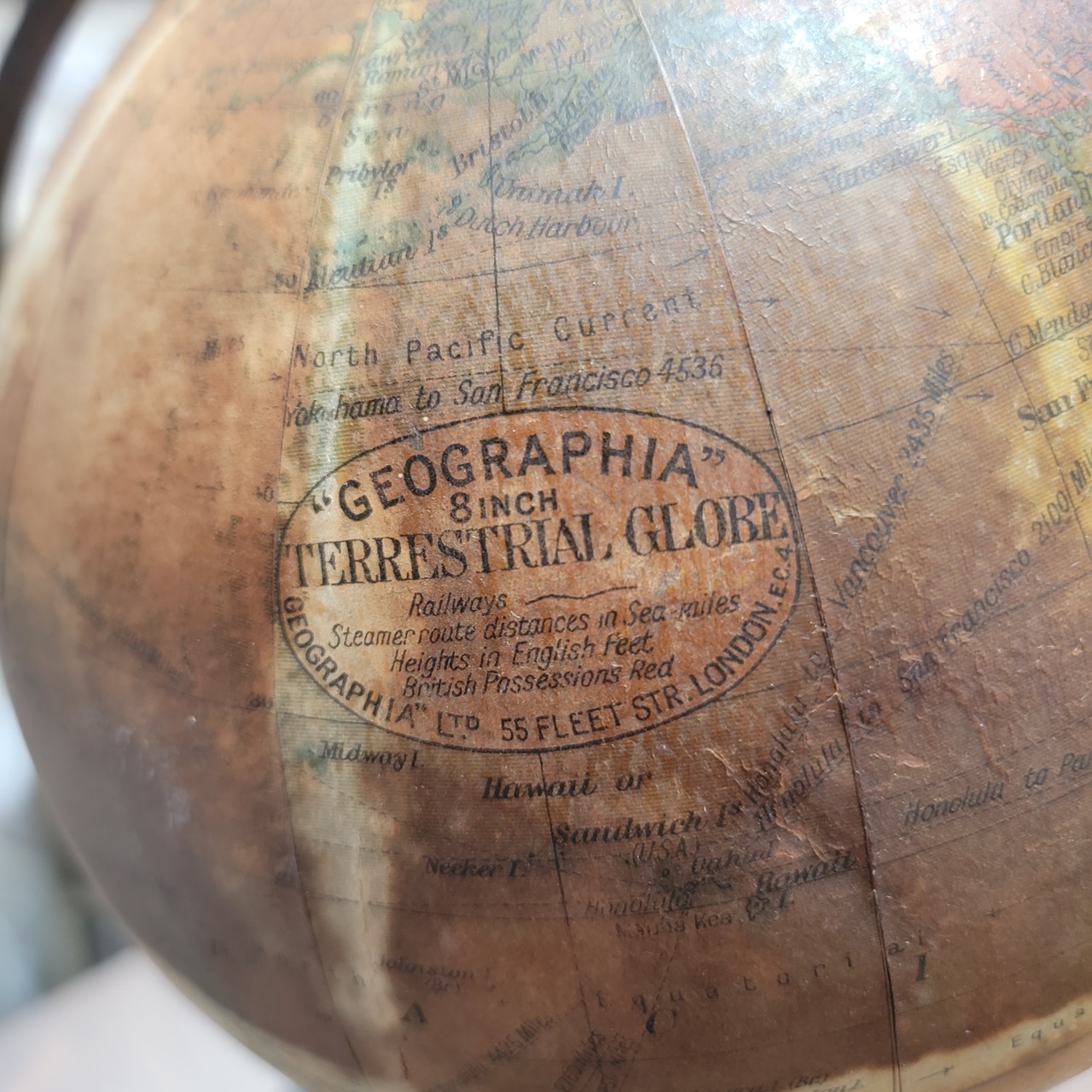 This piece combines two traditions that often stand alone, early 20th-century educational cartography and classical figurative sculpture. The globe itself is an 8-inch terrestrial example by Geographia of London, bearing the company’s characteristic labeling that notes railways, steamer route distances in sea miles, heights in English feet, and British possessions marked in red. These details place the globe squarely in the era when world travel, empire, and industrial connectivity shaped how geography was taught and visualized.