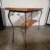 The solid wood top shows natural grain variation, knots, and age marks that speak to its reclaimed origin, finished in a soft, honey-toned patina that reads warm without glare. The iron base is forged with organic curves and leaf detailing, giving the structure a subtle sculptural quality without tipping into ornament. A lower wood shelf adds visual balance and practical surface area for books, baskets, or objects meant to live quietly in the room.