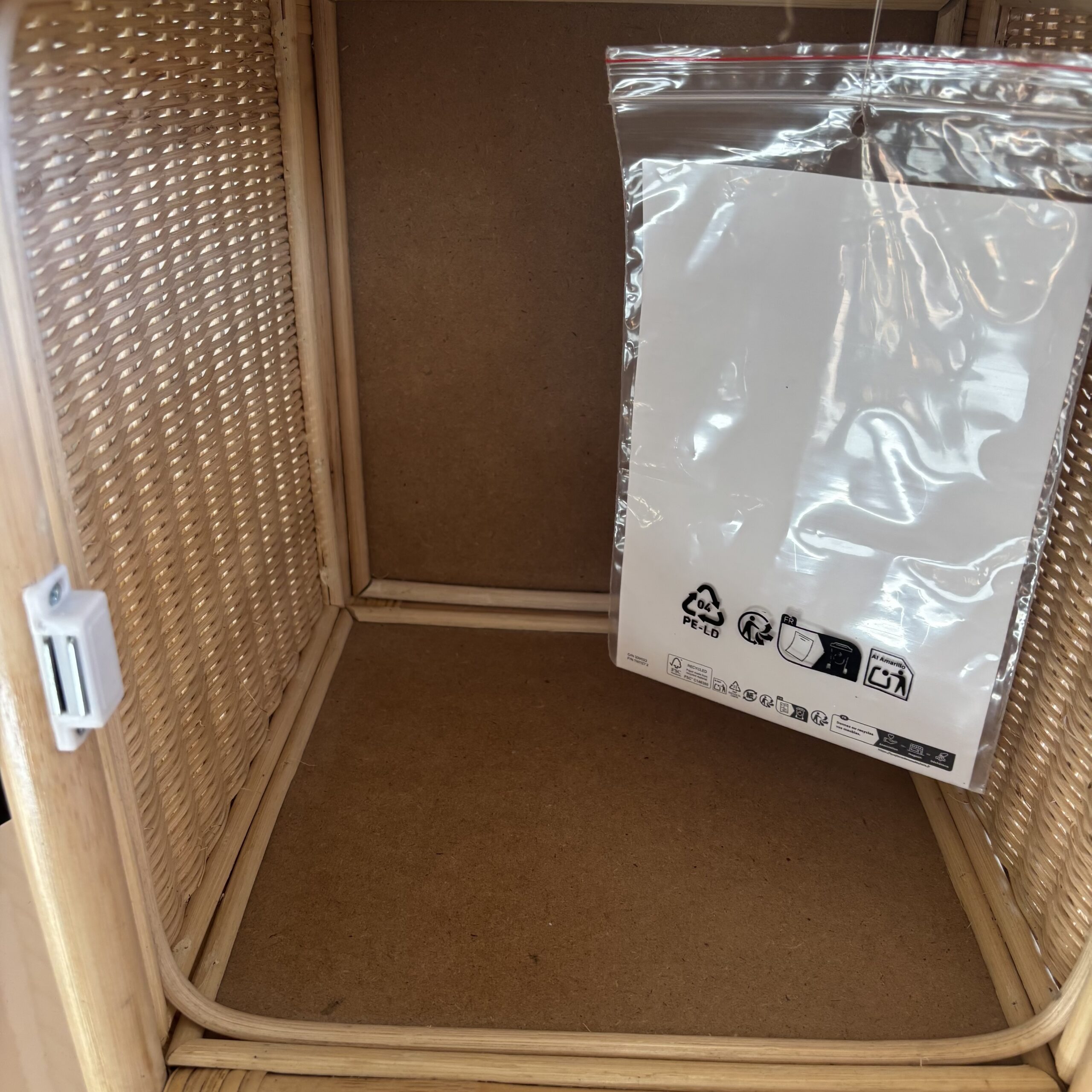 The woven rattan panels add visual softness while keeping the form breathable and casual. A single front door opens to a clean interior cavity sized for books, small linens, or everyday items you want contained but close at hand. The scale is compact and efficient, easy to place on the floor, a low platform, or tucked beside seating.