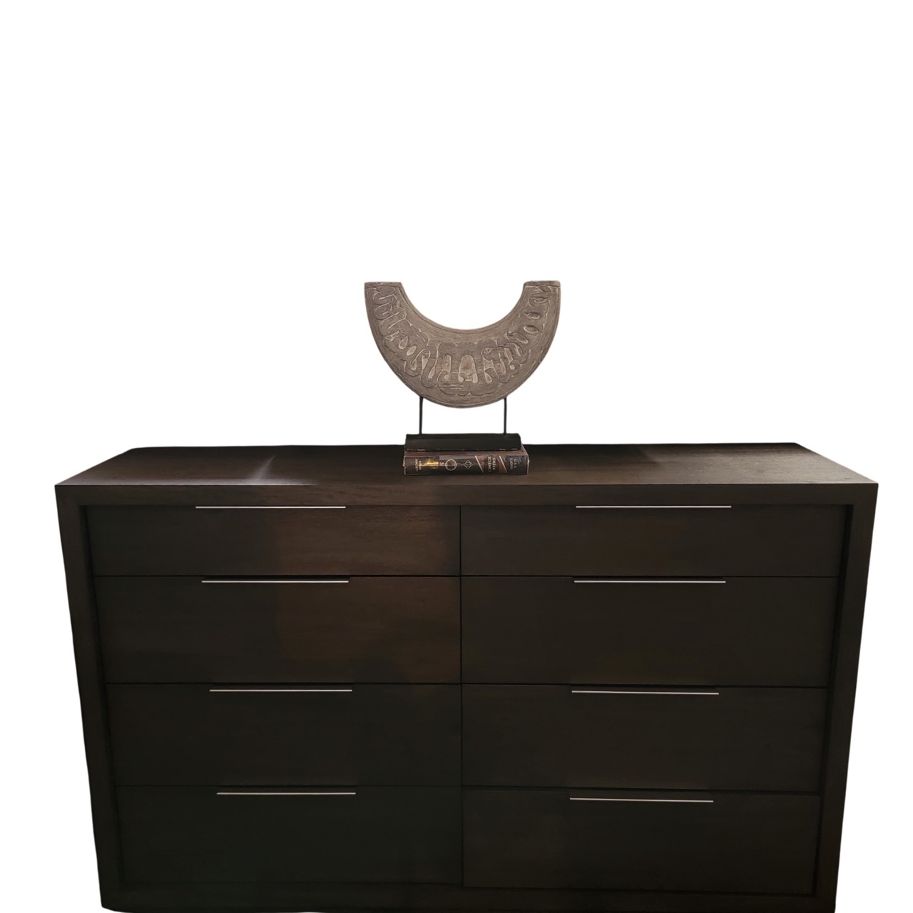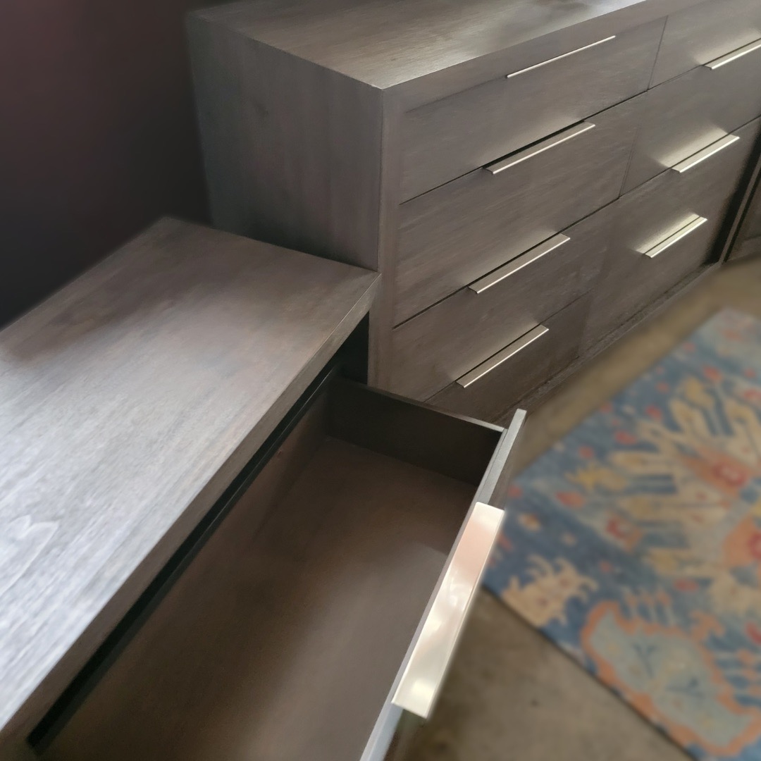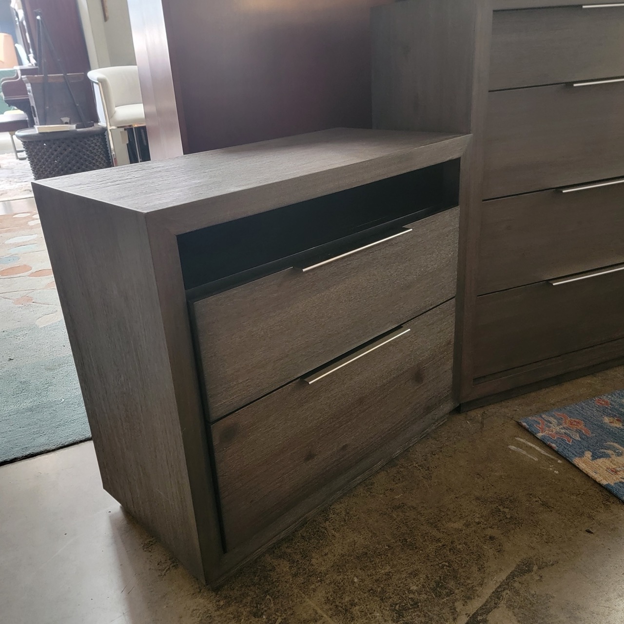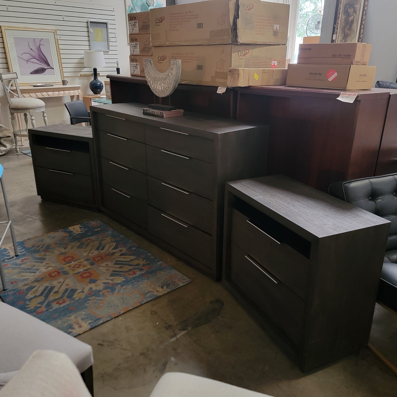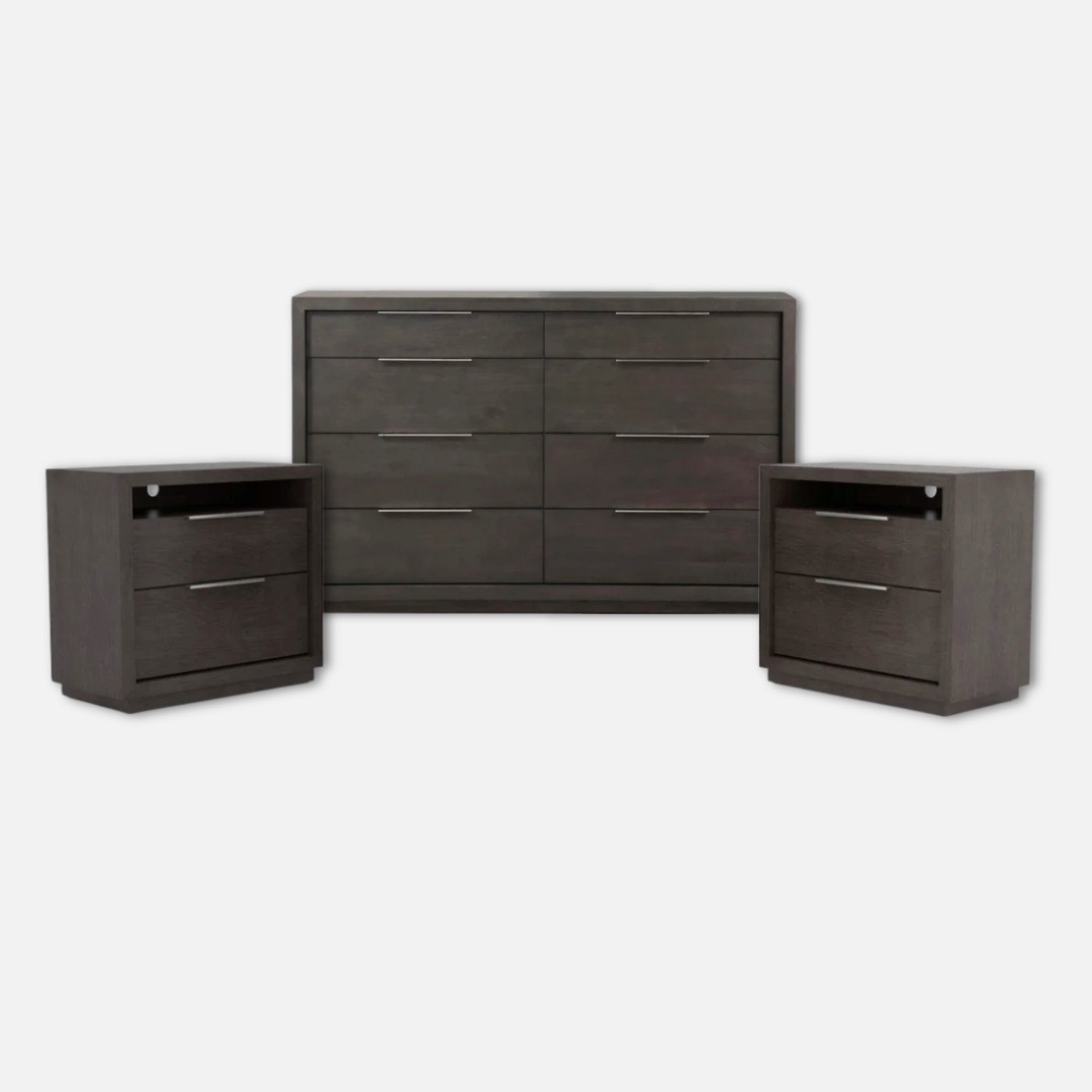 This set lands quiet and modern, charcoal-toned wood, clean lines, and hardware that reads crisp without going flashy. The dresser gives you real storage without feeling bulky, and the matching nightstands keep the bedside practical with an open cubby for books, chargers, or a basket, plus two drawers for everything you want hidden.