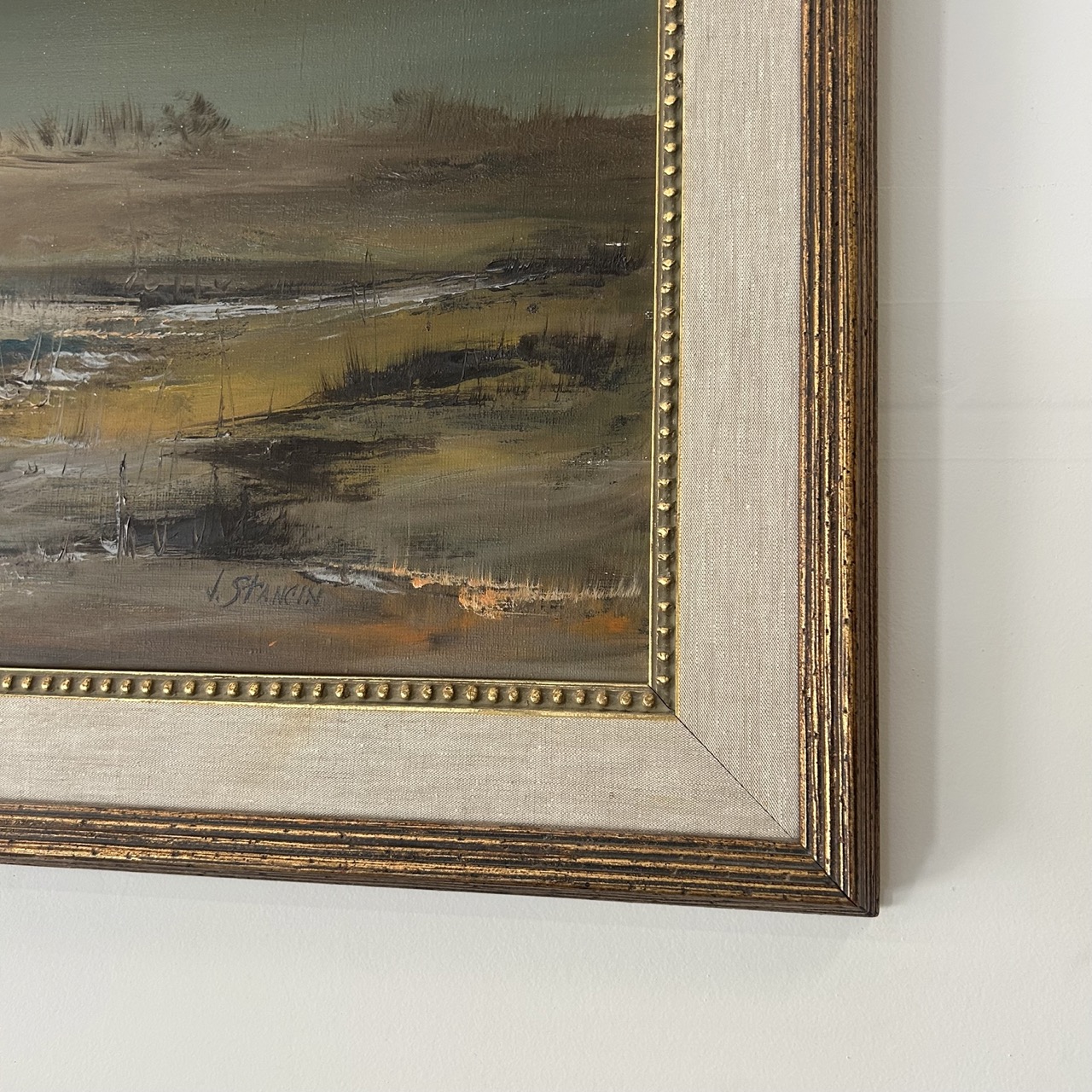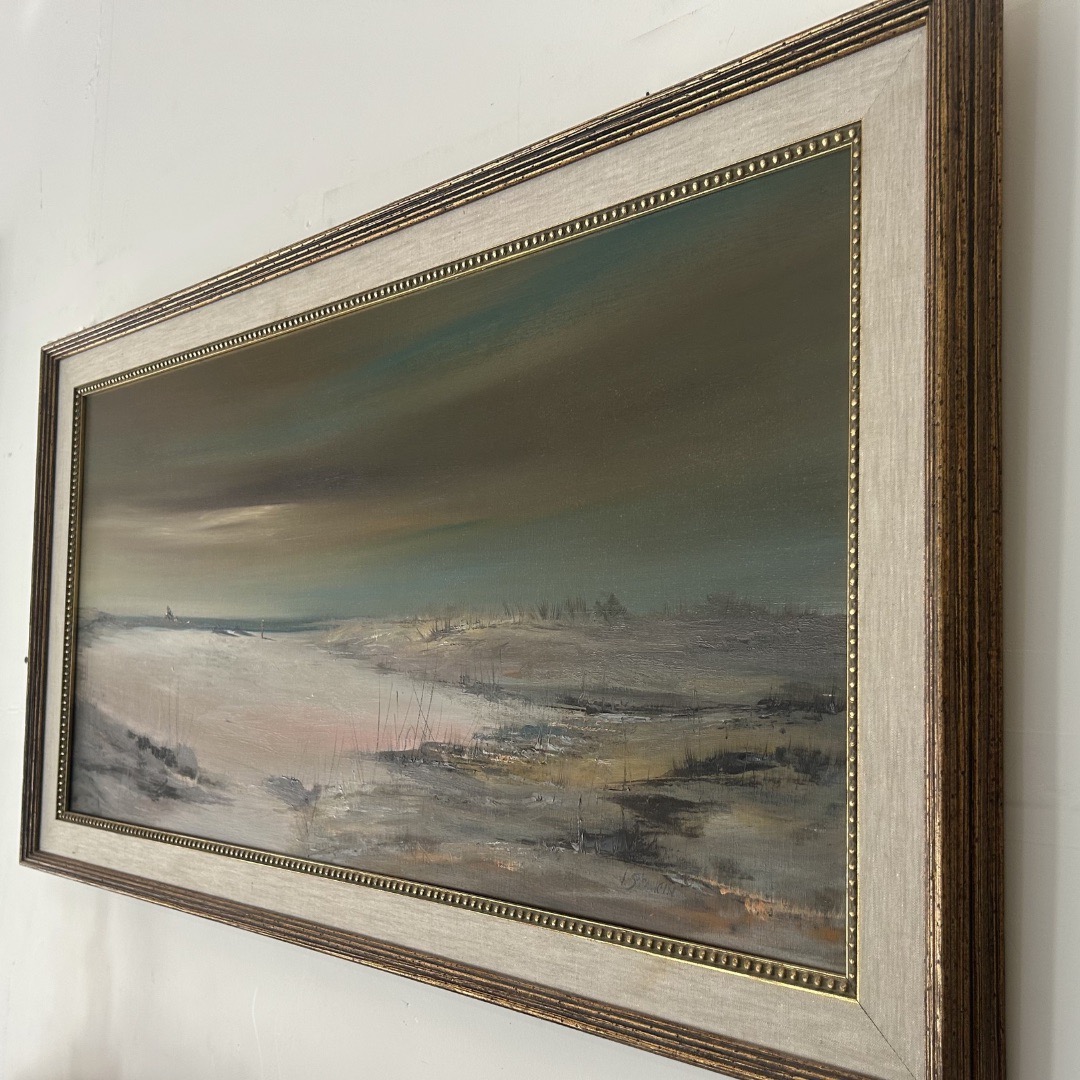 This framed coastal landscape by J. Stancin captures the stillness of a shoreline at low tide, where sand, water, and sky dissolve into one another under a muted horizon. Soft brushwork and layered tones of gray, olive, and warm sand create a calm atmospheric scene that reads quietly across a wall without overpowering the room. Available to view in person at Design Consignment Gallery. No lead time, the painting shown is the exact piece available now.