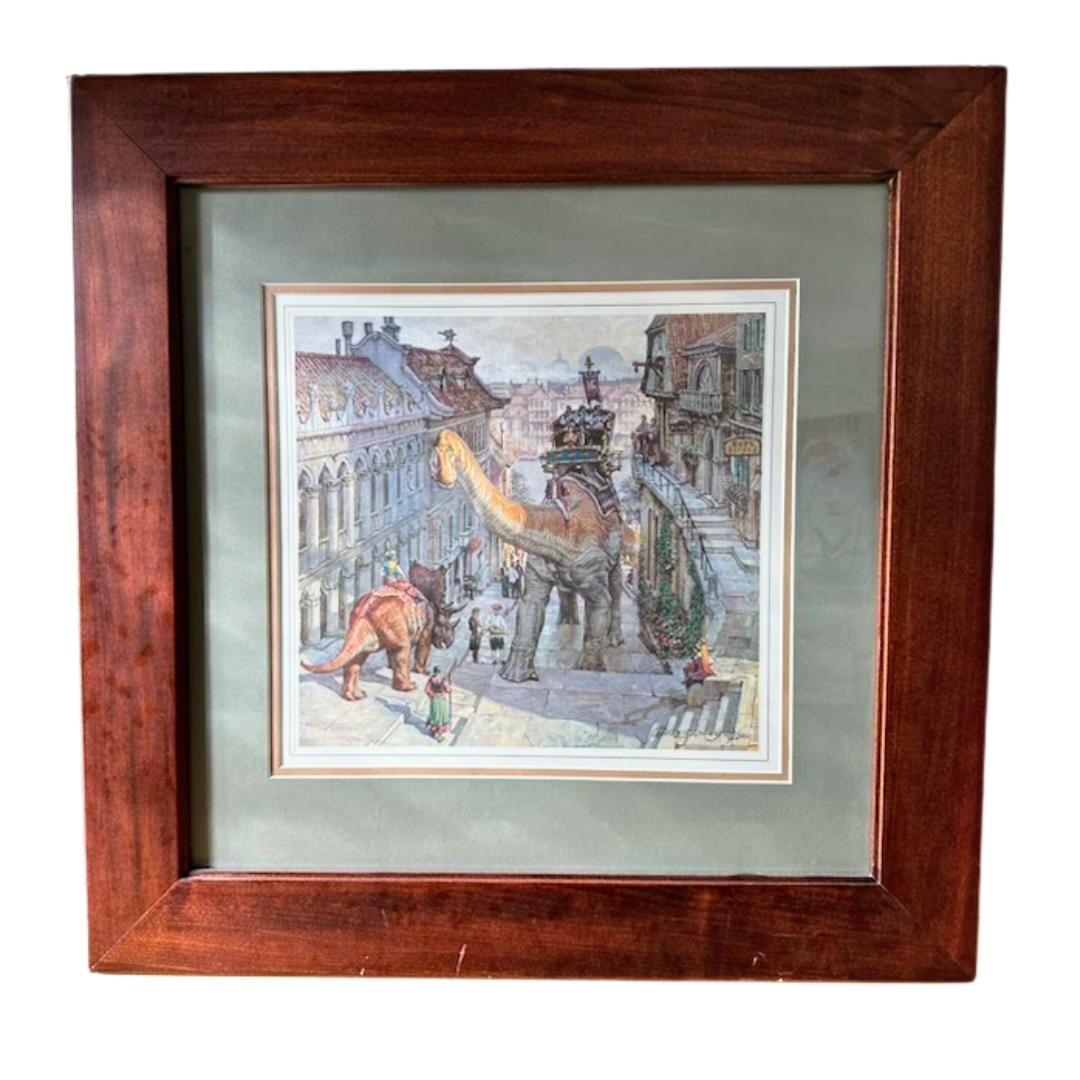 Celebrate the world building of James Gurney, the acclaimed illustrator behind Dinotopia. “Steep Street” delivers his cinematic perspective and warm storytelling in a signed, limited edition print numbered 755 of 3500. The piece is professionally presented with a solid wood frame and a layered mat that sets off the palette. Ideal for a reading nook, office, or gallery wall. Great gift for illustration and fantasy art collectors. Clean image area. Frame shows light showroom wear, see photos for details. Ready to hang today.
