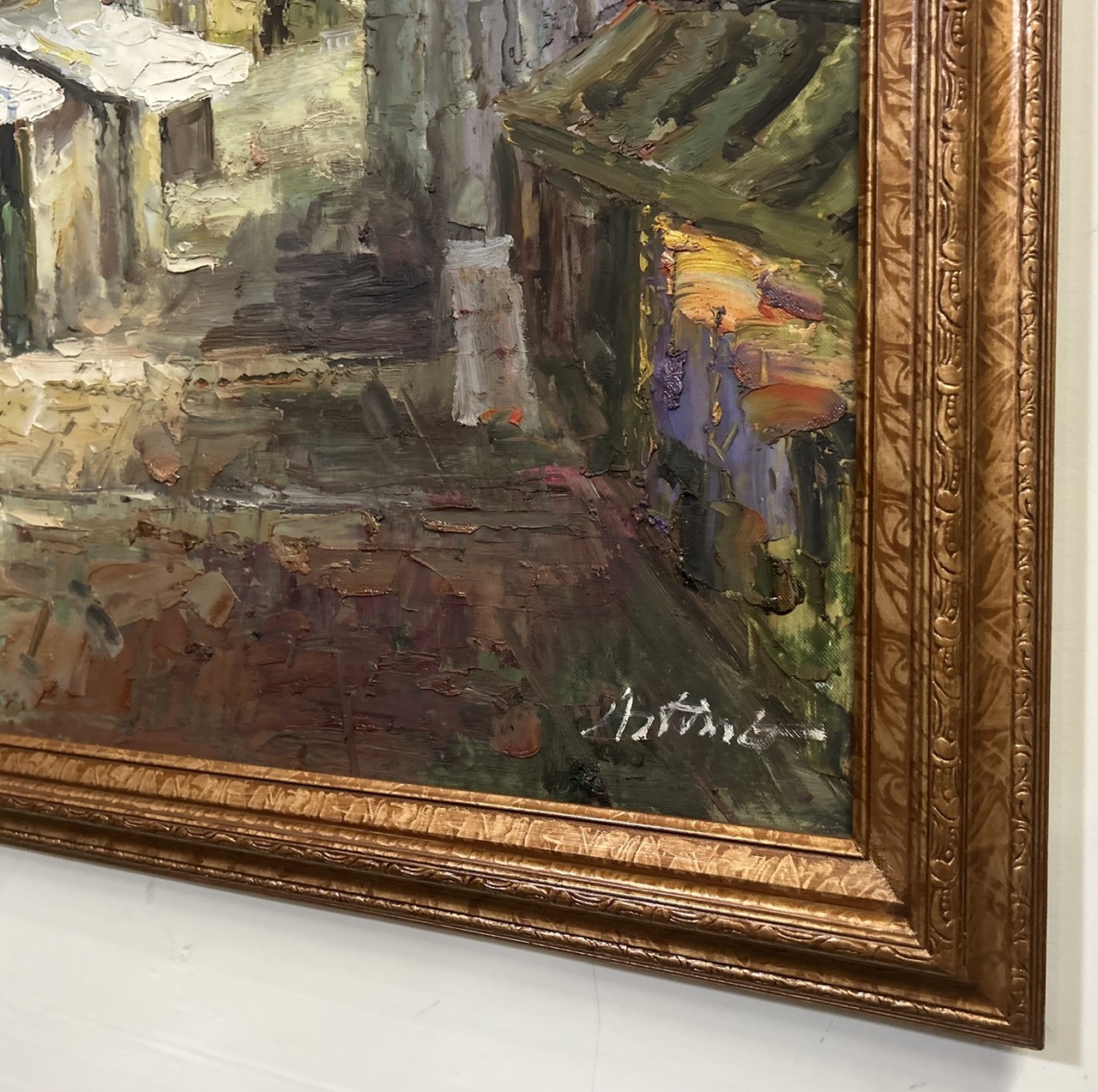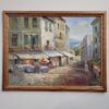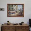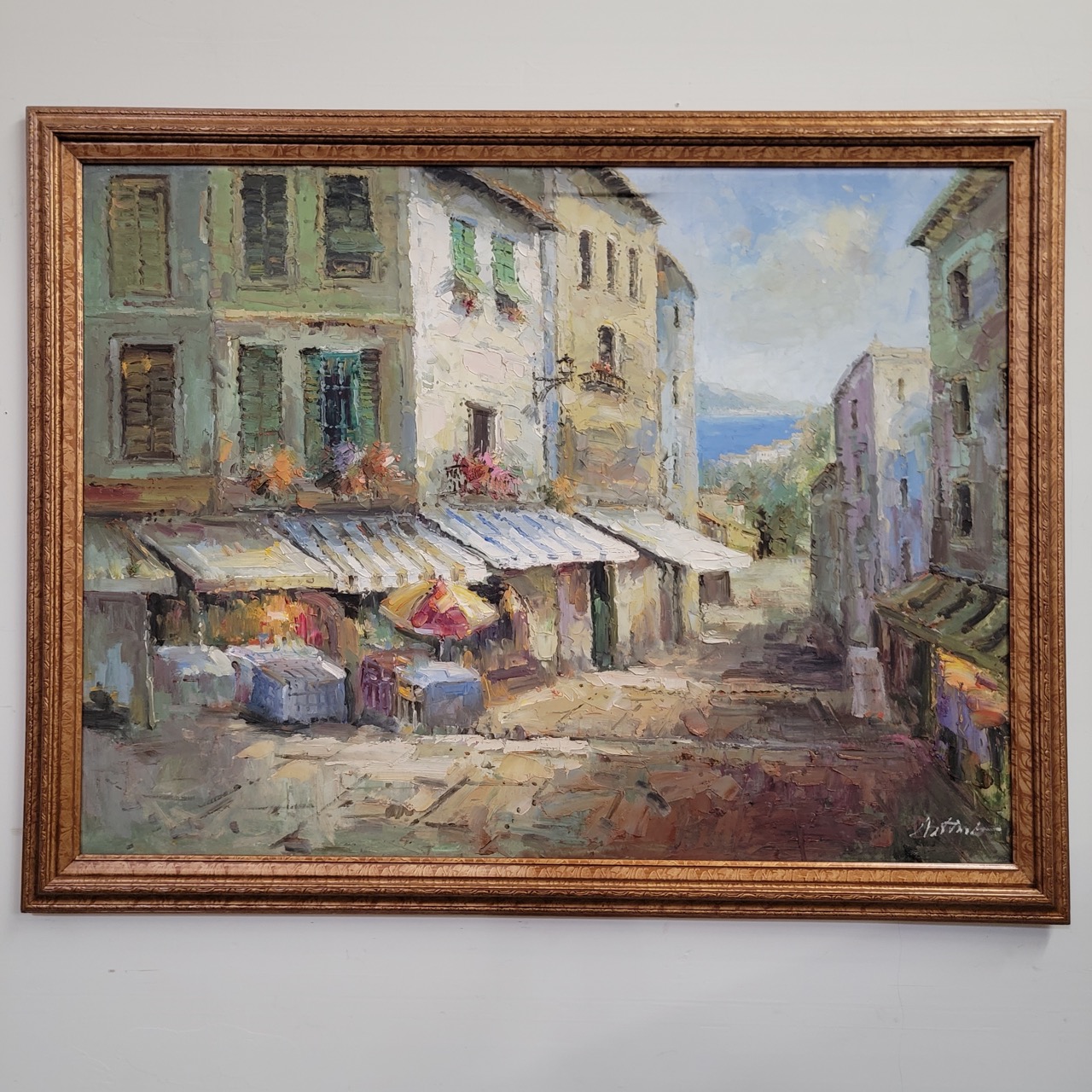 This oil painting presents a quiet European village street, with sun-washed buildings, café awnings, and a distant hint of blue horizon. The loose, impressionistic brushwork creates a relaxed, lived-in atmosphere that feels both scenic and inviting.
