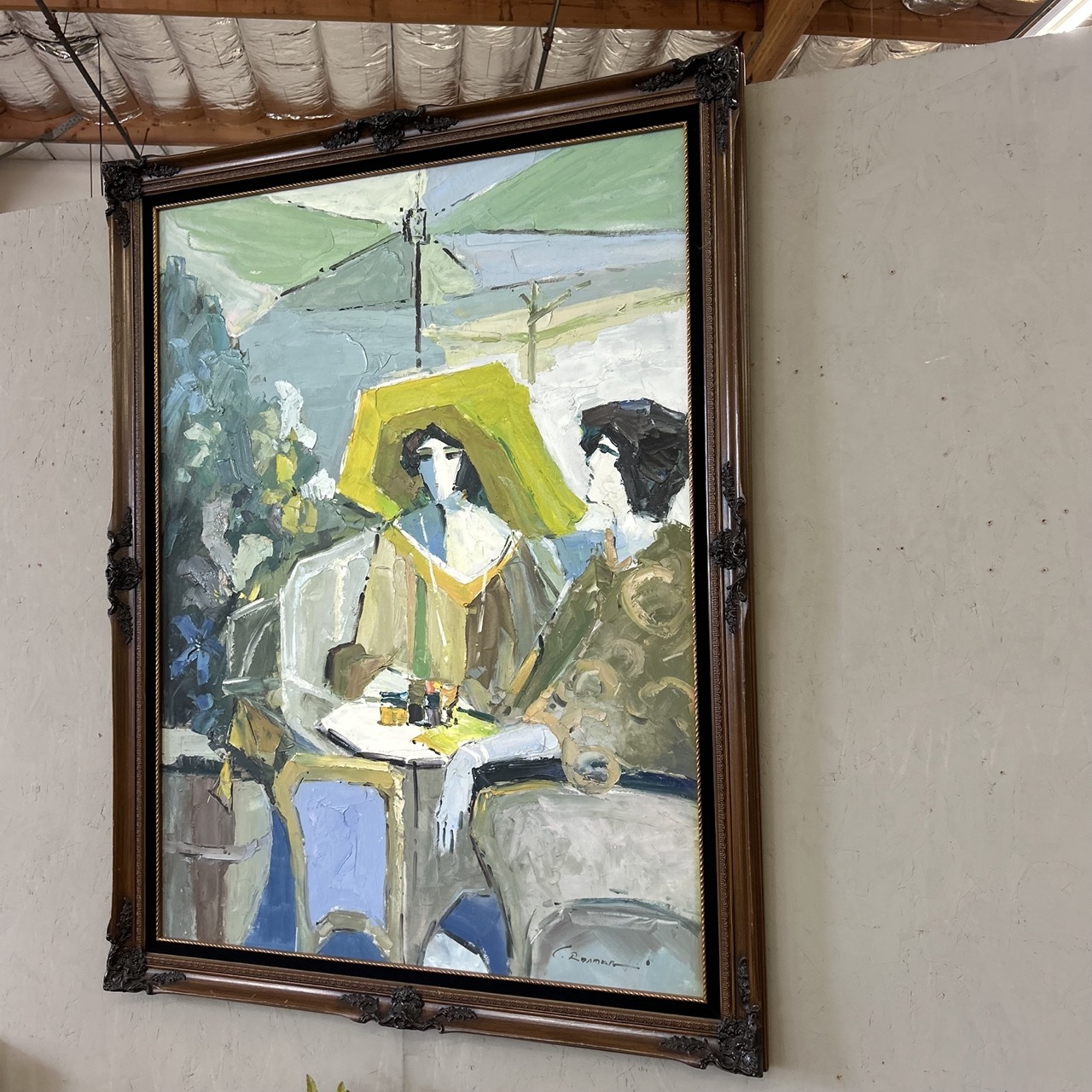 Bold palette, confident brushwork, and simplified figures give this café scene a timeless, lived-in feeling, more about atmosphere than literal detail. The composition draws you inward, two figures gathered at a table beneath an umbrella, caught in a quiet moment that feels both personal and public.