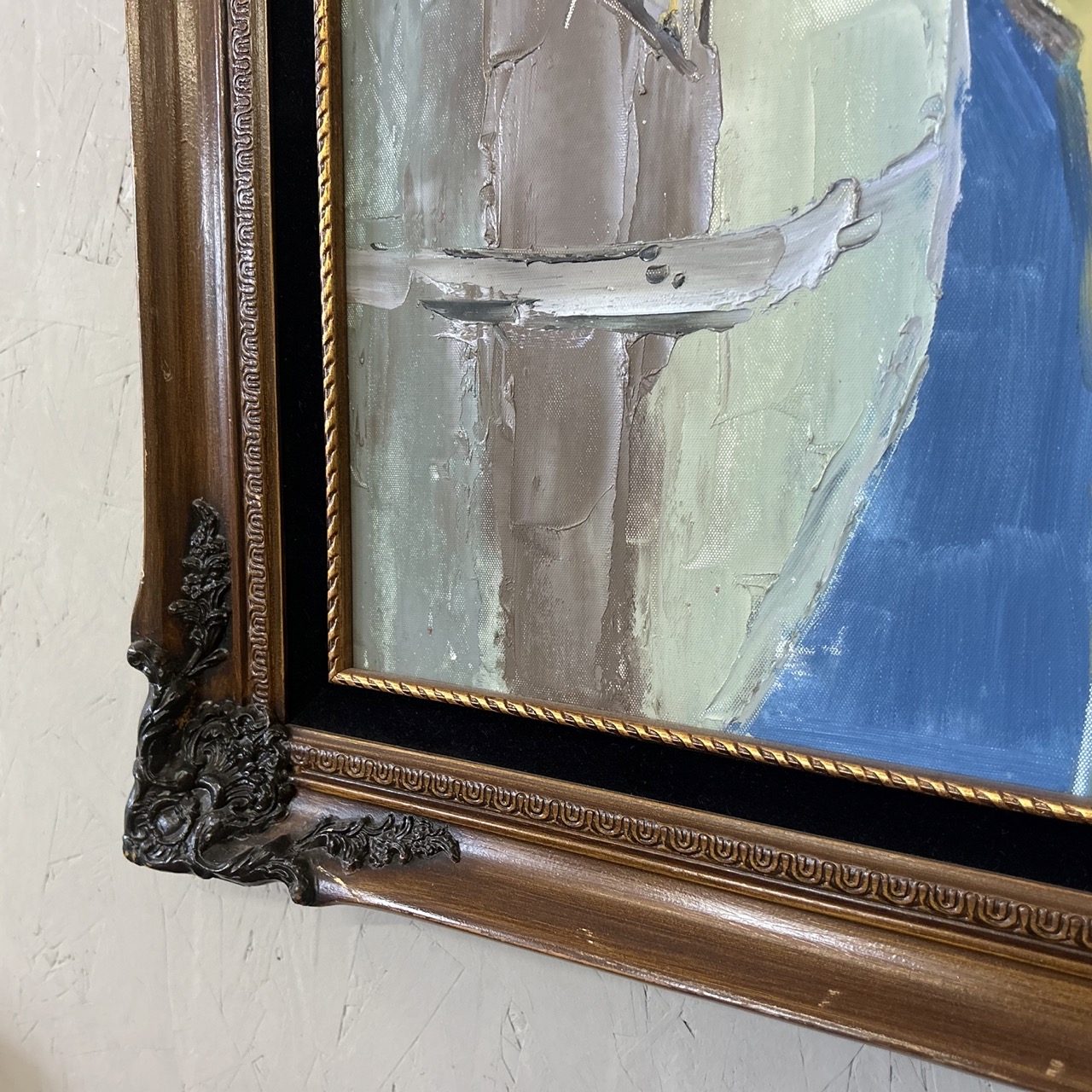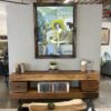 The scale matters here. At over four and a half feet tall, it reads as a statement piece rather than decoration. The heavily carved traditional frame adds contrast, grounding the modern, expressive painting and giving it authority on the wall. It works especially well above a console, credenza, or long bench where its verticality can breathe.