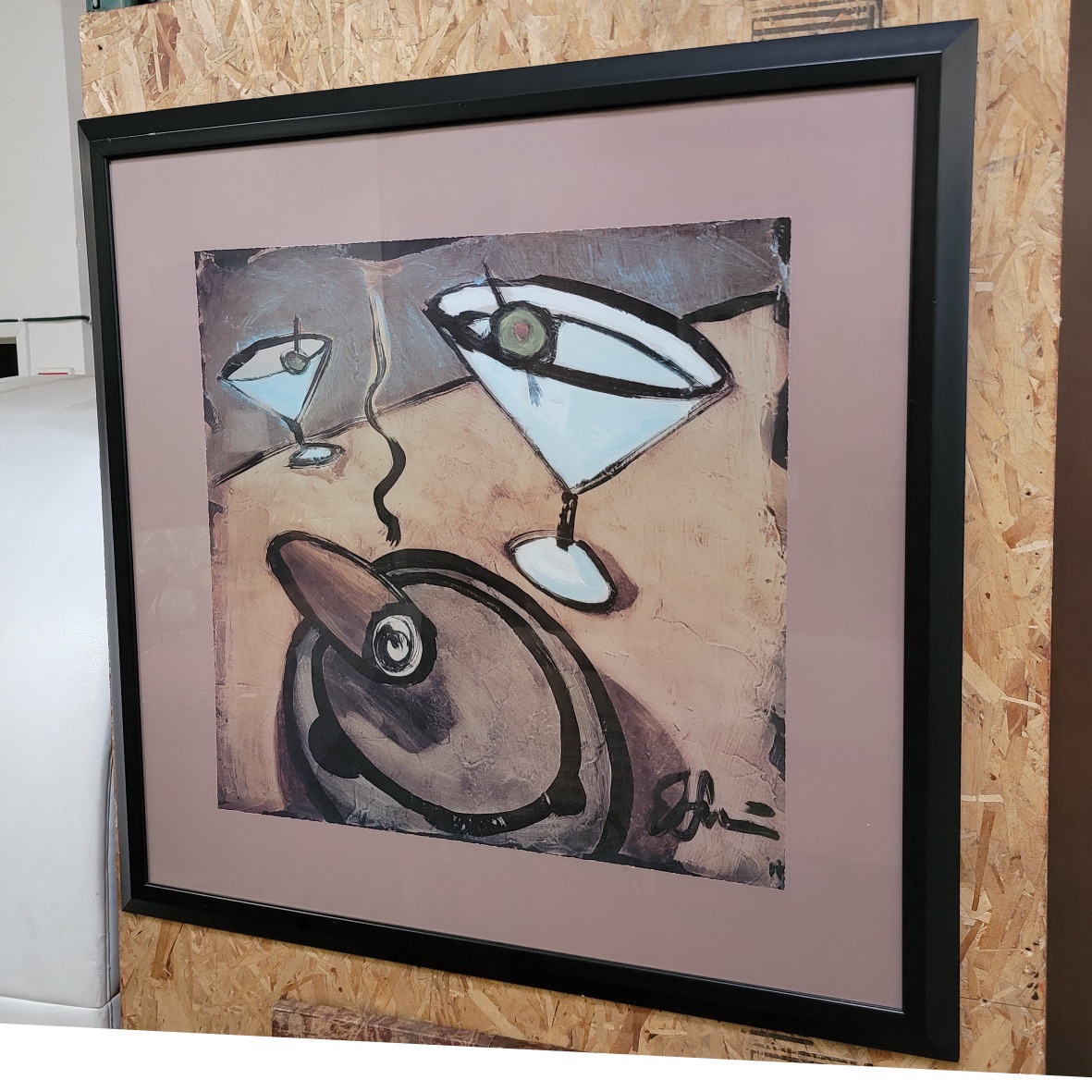 This large-scale modern abstract figurative painting centers on a playful martini motif rendered with confident, gestural linework and a muted, modern palette. The composition balances humor and edge, pairing graphic shapes with expressive brushstrokes that feel both spontaneous and intentional.