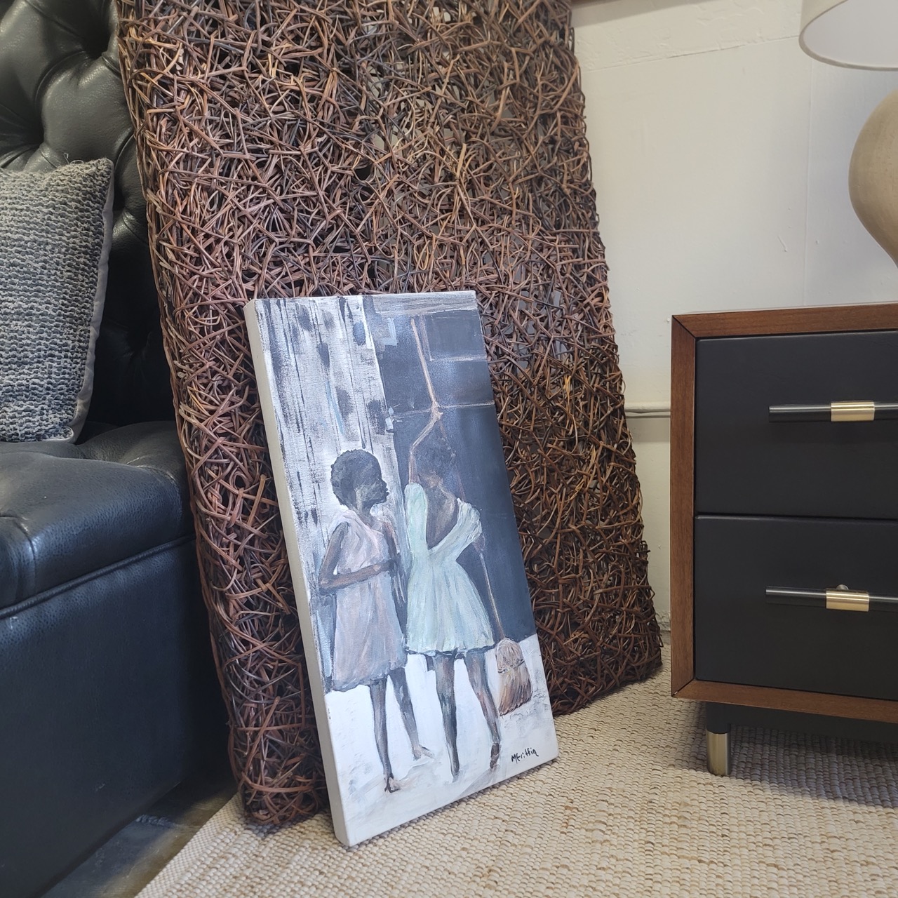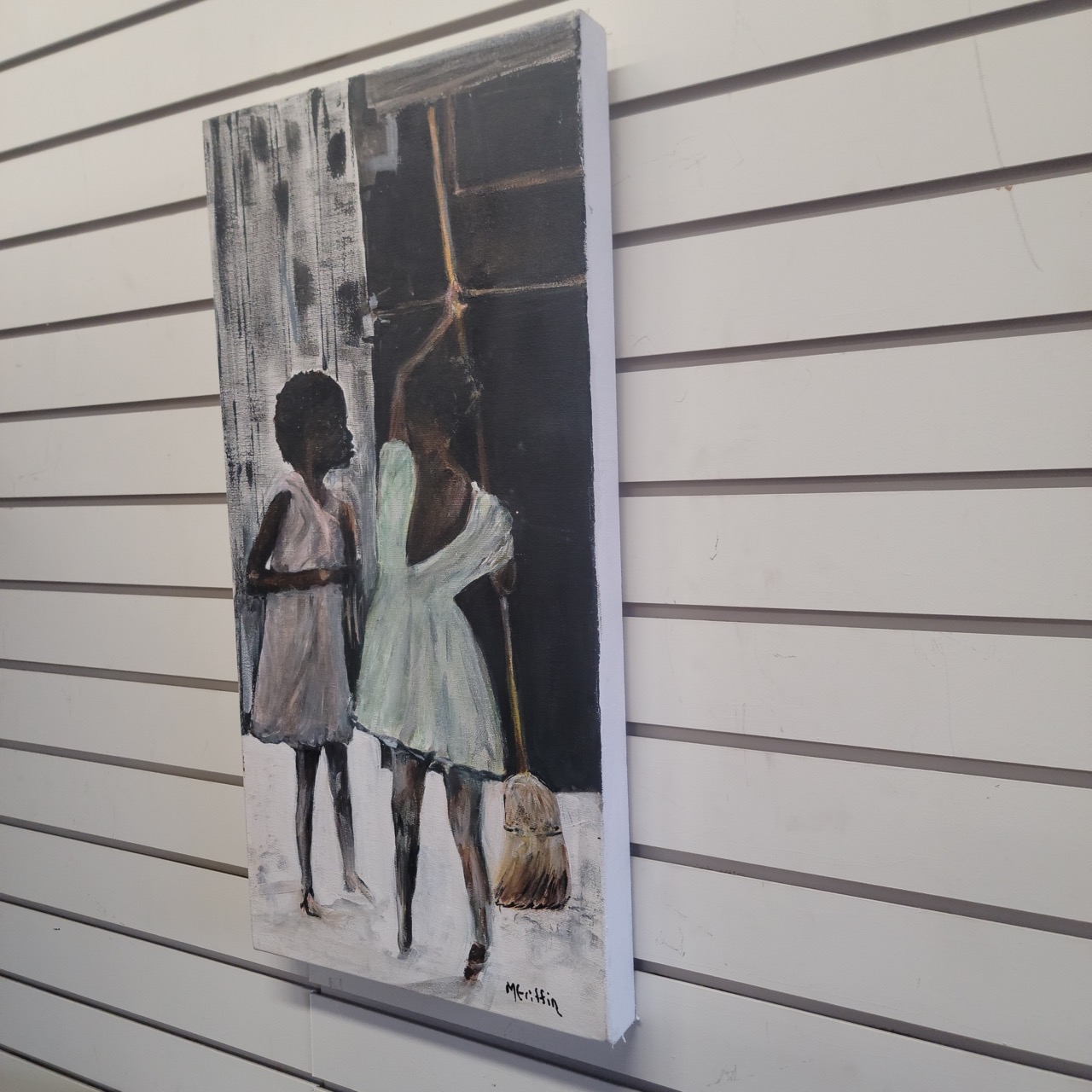 Its narrow vertical format makes it especially versatile. It works beautifully leaned on a shelf or credenza, placed in a quiet hallway, or hung where a subtle emotional note is welcome rather than a statement meant to dominate. This is a piece that rewards proximity and time, revealing more with each viewing rather than announcing itself all at once.