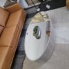 At four feet wide, the scale feels intentional without overwhelming a seating area. The oval footprint softens harder lines and improves circulation around the piece. The faux shagreen wrap is rigid and sealed, designed for durability rather than softness. Mirrored inset is flush and intact. Very good showroom condition.