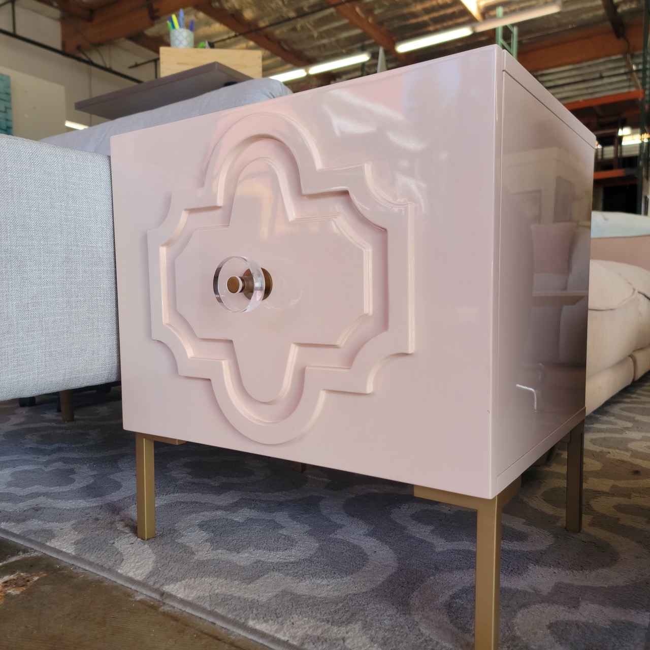 Single glossy blush pink lacquer nightstand by TOV Furniture with sculptural front, brass-tone legs, and two smooth drawers. A playful yet polished pop of color for bedside or living room. This nightstand by TOV Furniture is finished in a glossy soft blush tone with dimensional sculptural drawer front and polished hardware. The slim brass-tone legs keep the piece feeling light while still grounding the look.