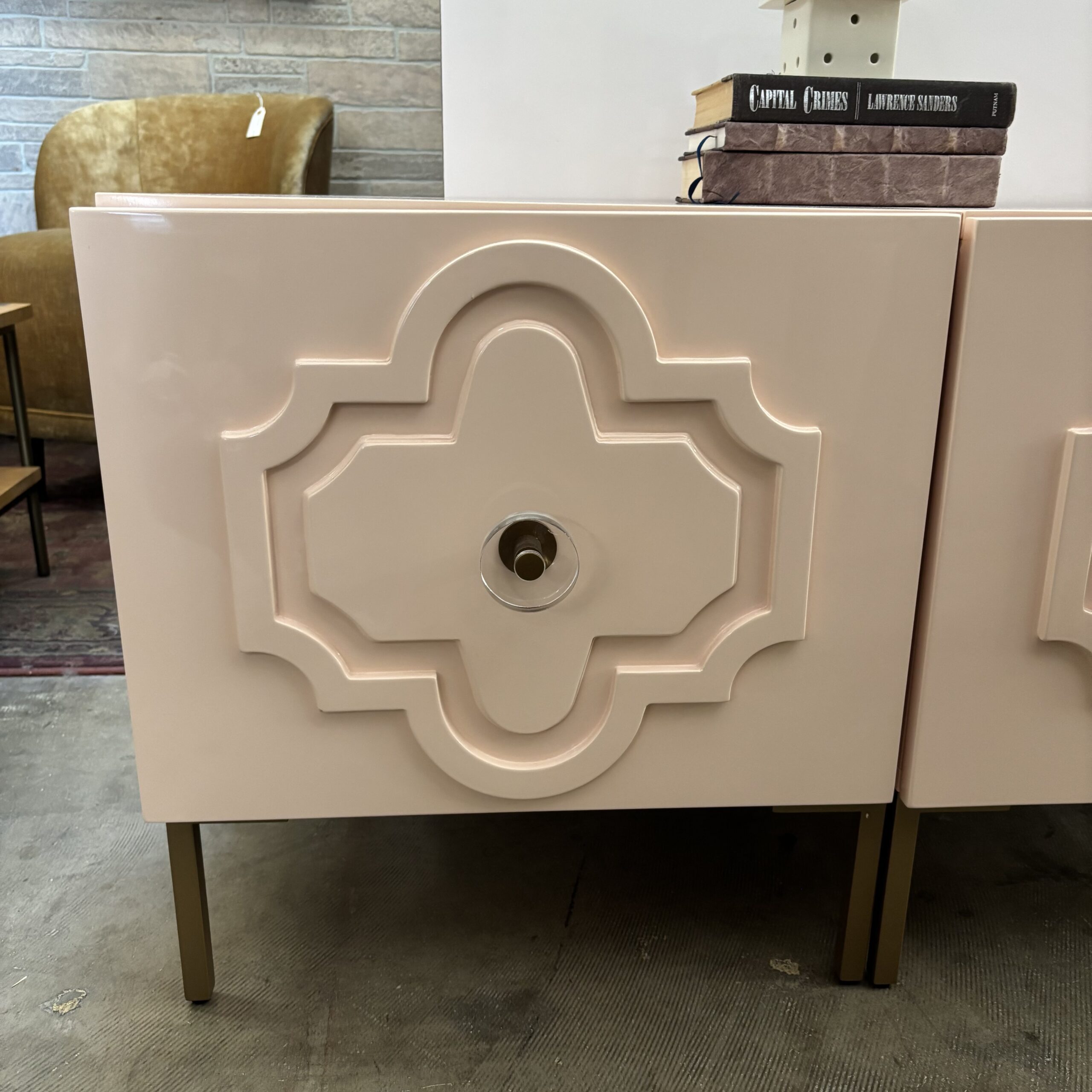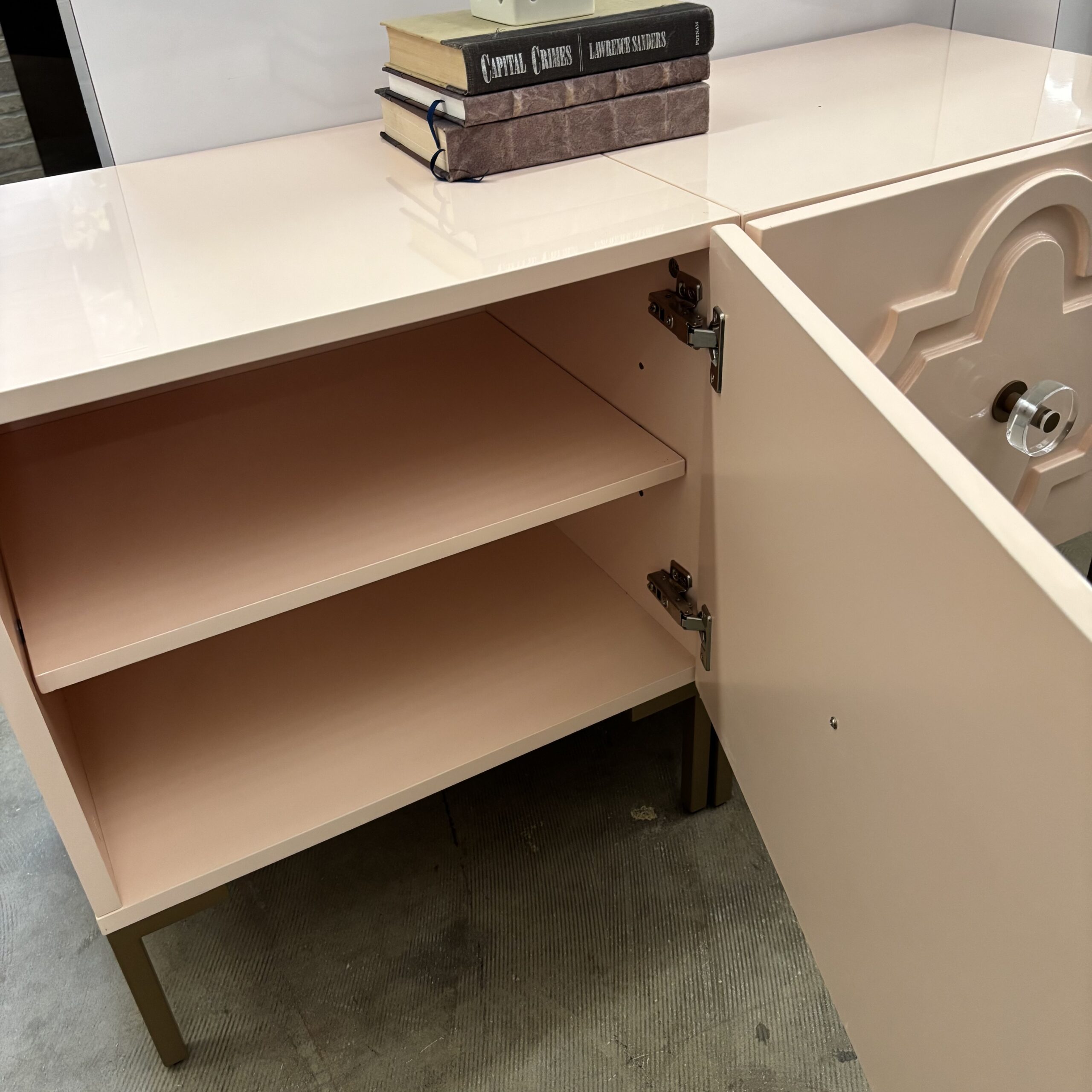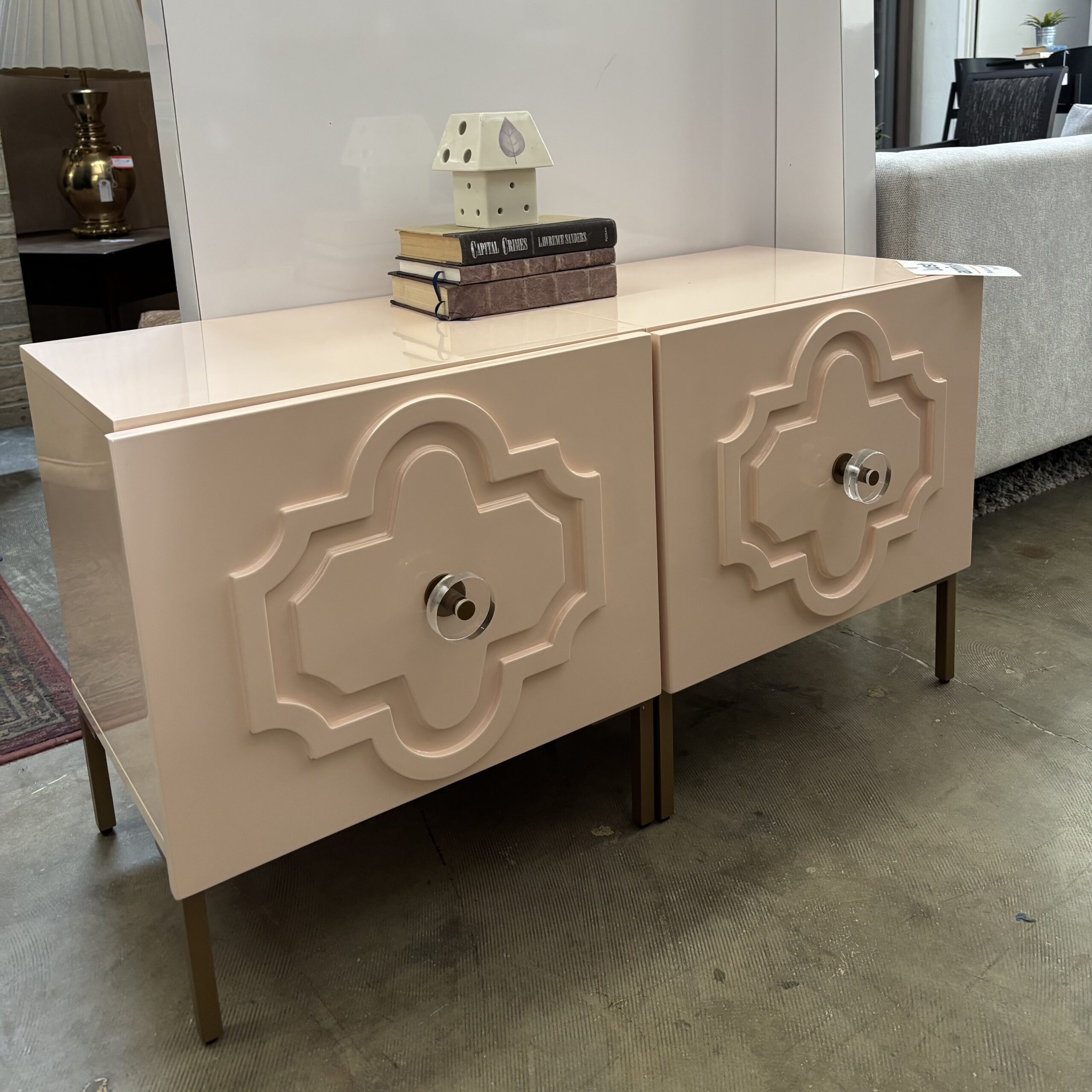 Set of two glossy blush-pink lacquer nightstands with dimensional drawer fronts and polished hardware — a playful but elevated look. Each piece offers two smooth drawers for bedside essentials. Brightens neutral rooms or leans into glam styling with metallic accents. Excellent condition with clean lacquer and sturdy frames. Ideal as nightstands or side tables for a modern pop of color.