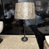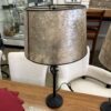 This pair of black iron table lamps brings a sleek sculptural look with a warm metallic glow. Each lamp stands 26 inches high and features a slim, curved base that feels both modern and timeless. The metallic drum shades have a slightly frosted, semi-transparent quality — softening light while creating a subtle shimmer that elevates any room.
