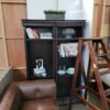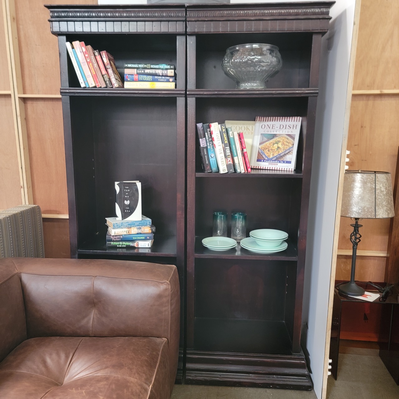 This matched pair of dark wood bookcase cabinets offers a flexible, architectural storage solution with strong vertical presence and a restrained, traditional profile.