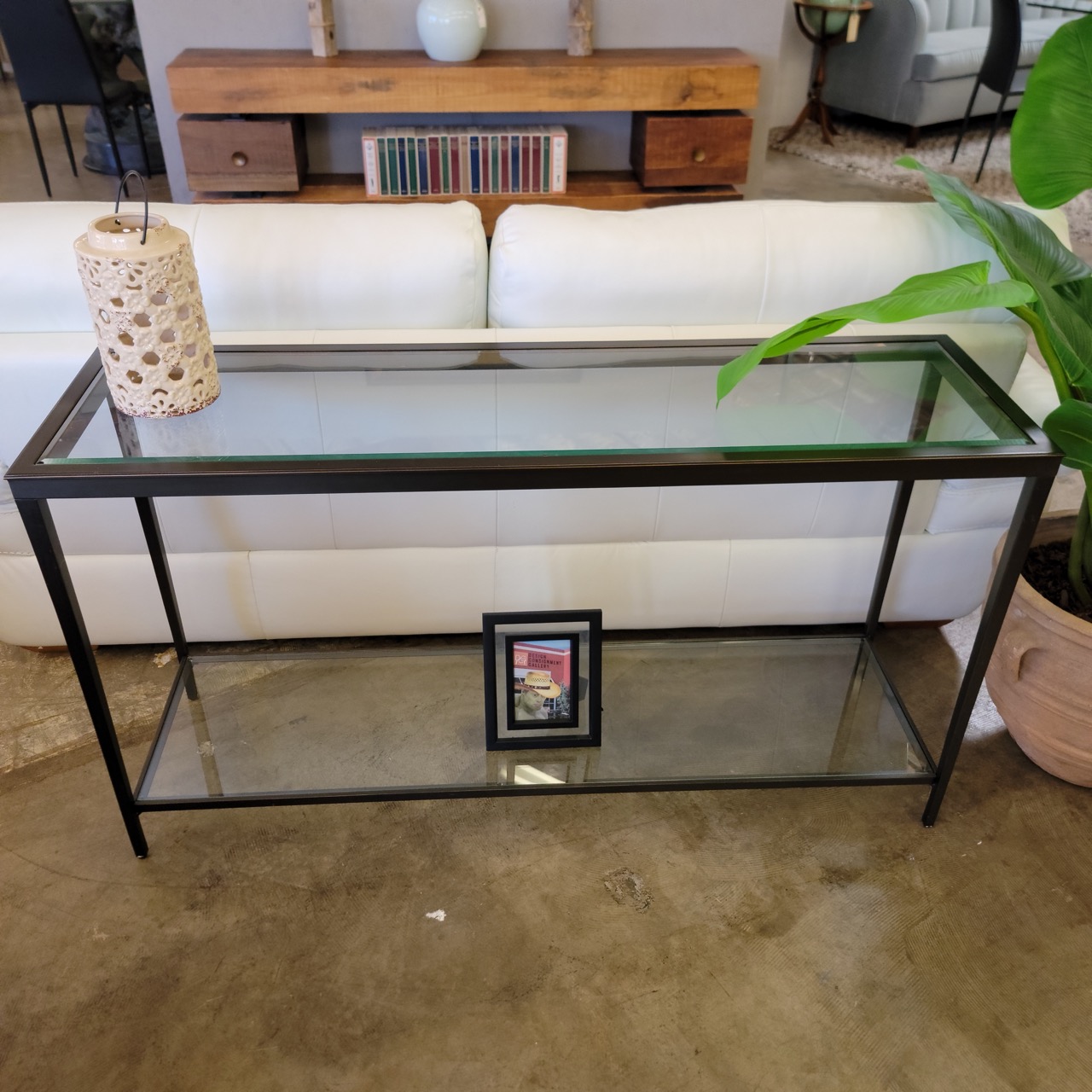 This Restoration Hardware console table brings structure without visual weight. The soft graphite metal frame reads crisp and architectural, and the clear glass top keeps the room feeling open and light. It’s a strong fit for modern, transitional, and minimalist spaces where you want function without clutter.