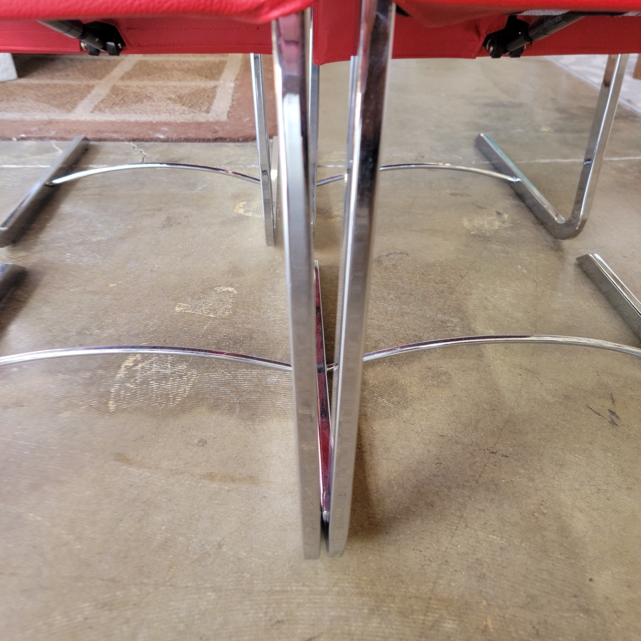 Designed by Roche Bobois, the Longitude dining chairs combine bold red upholstery with polished chrome cantilever frames, creating a strong contemporary profile that balances visual lightness with structural confidence. The 36.25-inch high back gives vertical presence at the table, while the 18.75-inch seat height pairs comfortably with standard dining tables.