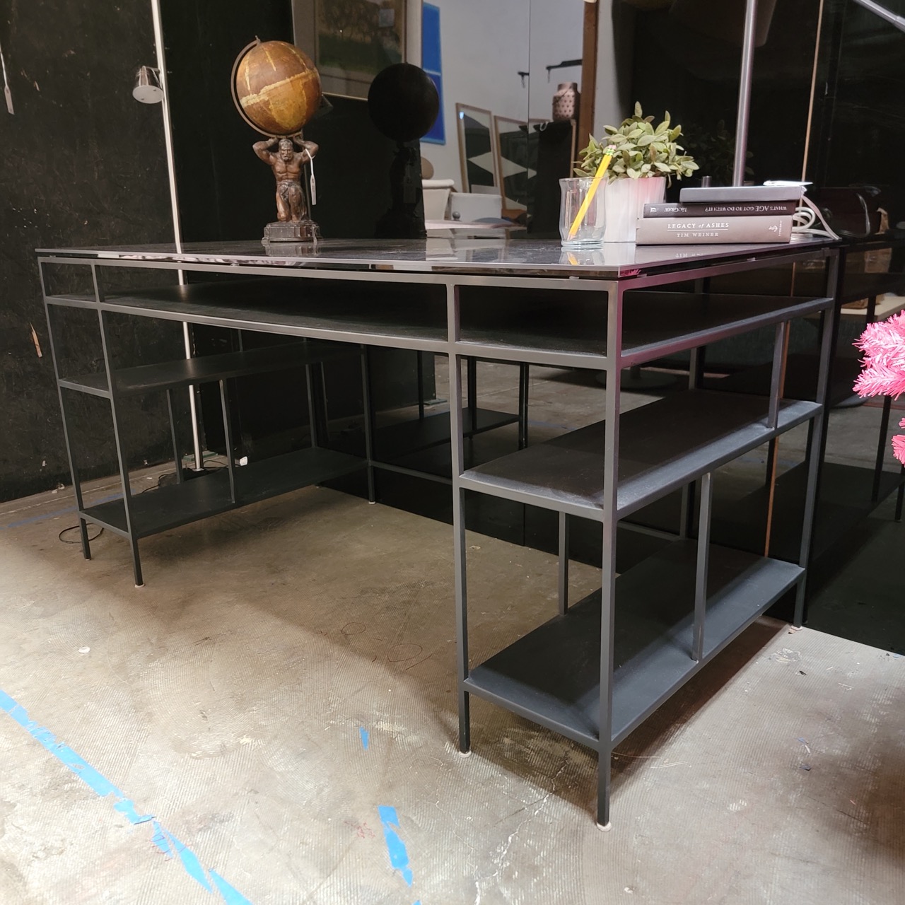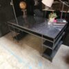 The Bowen’s appeal is structure, a crisp metal frame, a dark top with subtle stone-like veining, and open grid side panels that double as built-in shelving without turning the piece into bulky office furniture. It reads modern industrial, but the finish stays quiet and refined. The surface feels substantial, and the proportions are right for real work, laptop plus monitor, notebooks, camera gear, or a clean spread of paperwork without spilling over the edges.