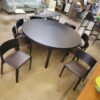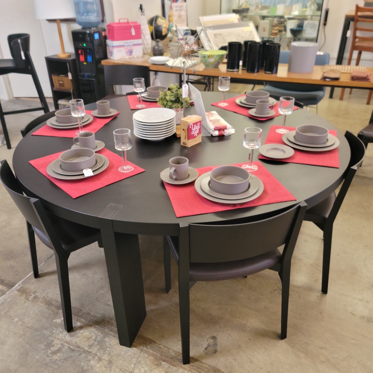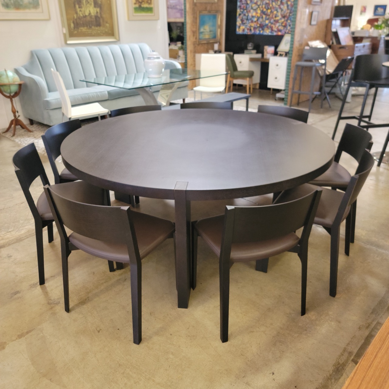 A rare 72 inch round Carbone-style dining table designed for serious hosting power. Its wide, smooth black wood surface rests on a striking three-legged geometric base that maximizes legroom and keeps the silhouette clean and modern.
