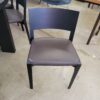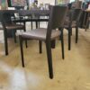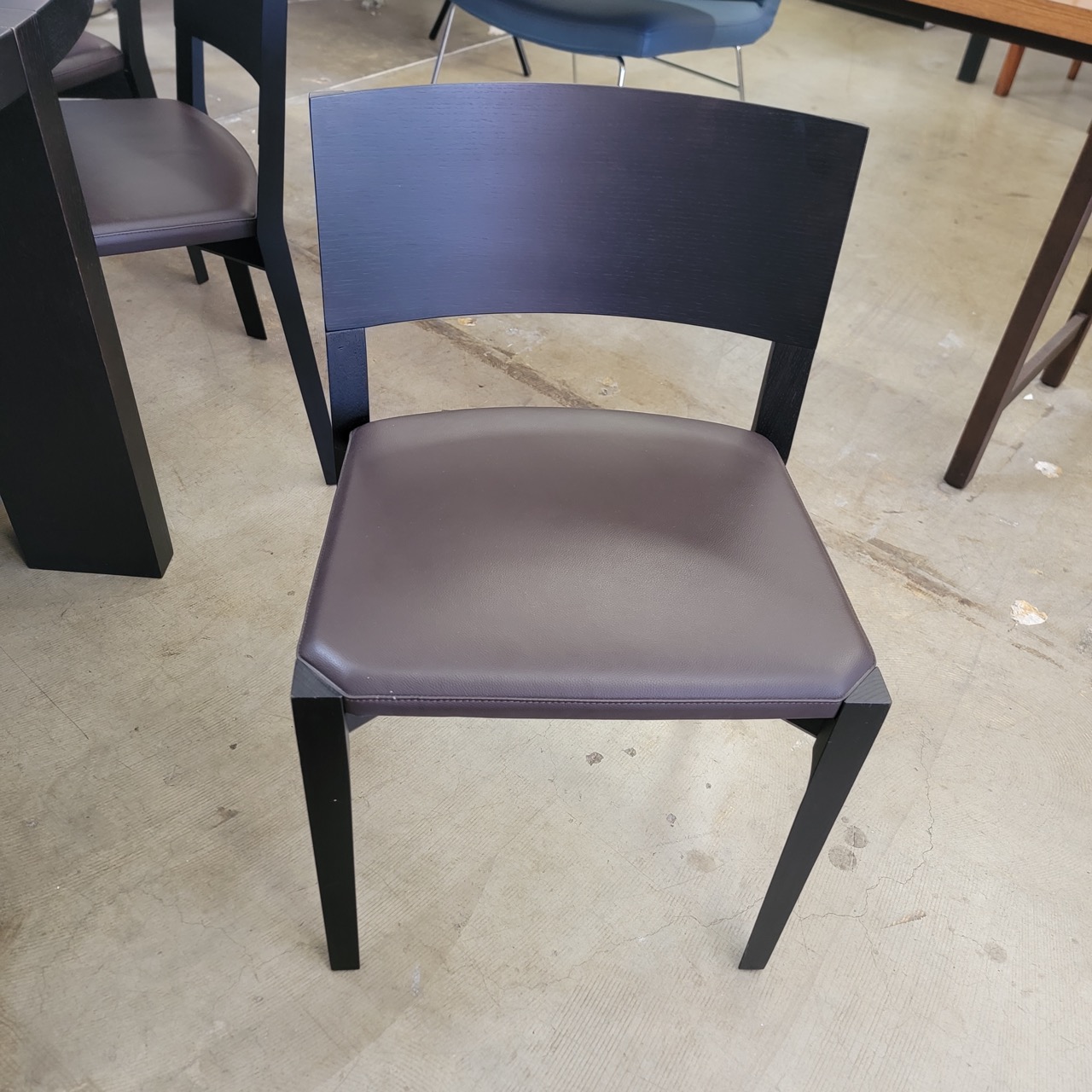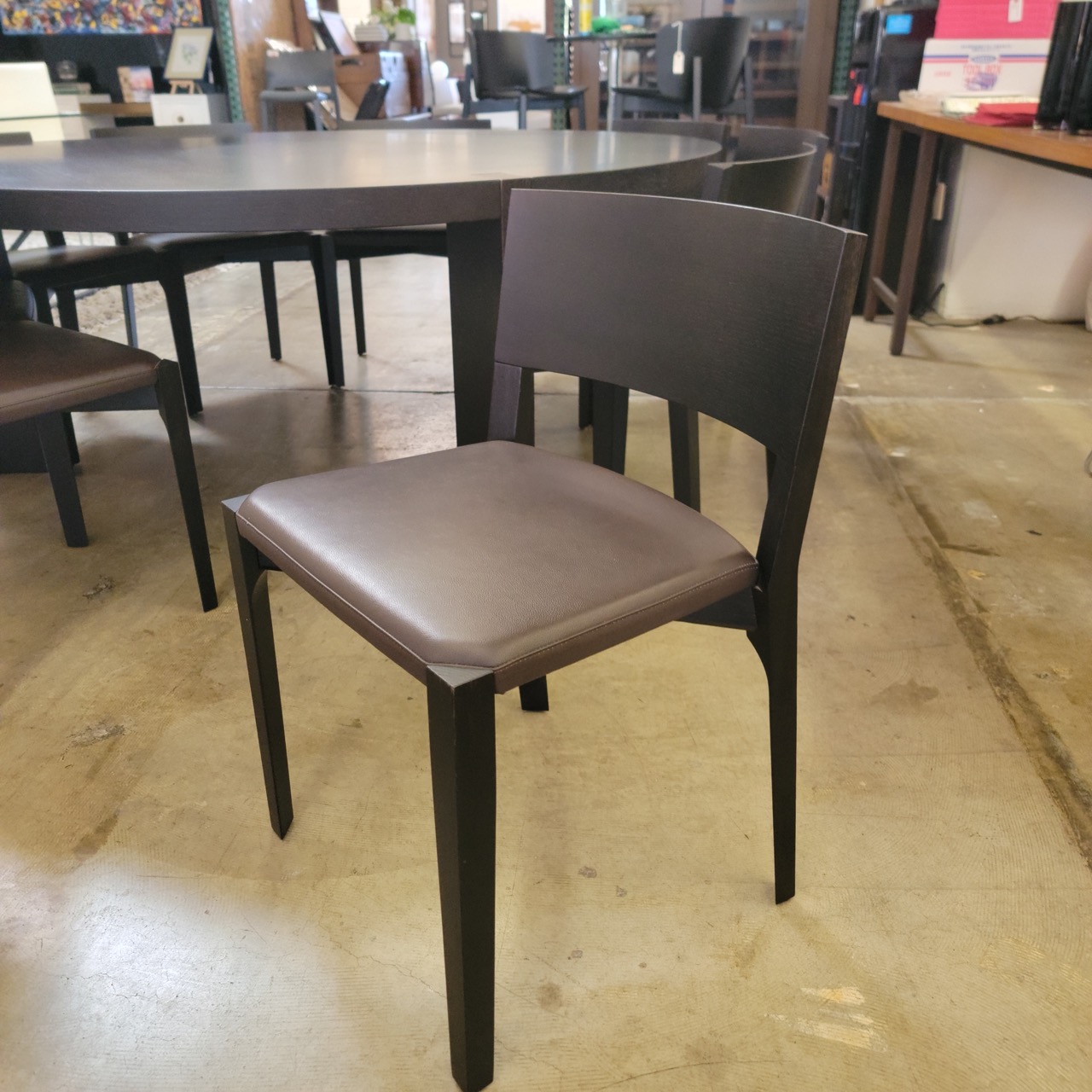 All nine matching chairs are included. Each features a faceted wood frame, a gently curved backrest, and a smooth padded leather seat in a deep taupe-brown tone. They push neatly under the table, with six fully tucking in and all nine fitting with a modest 2 inch pull-out.