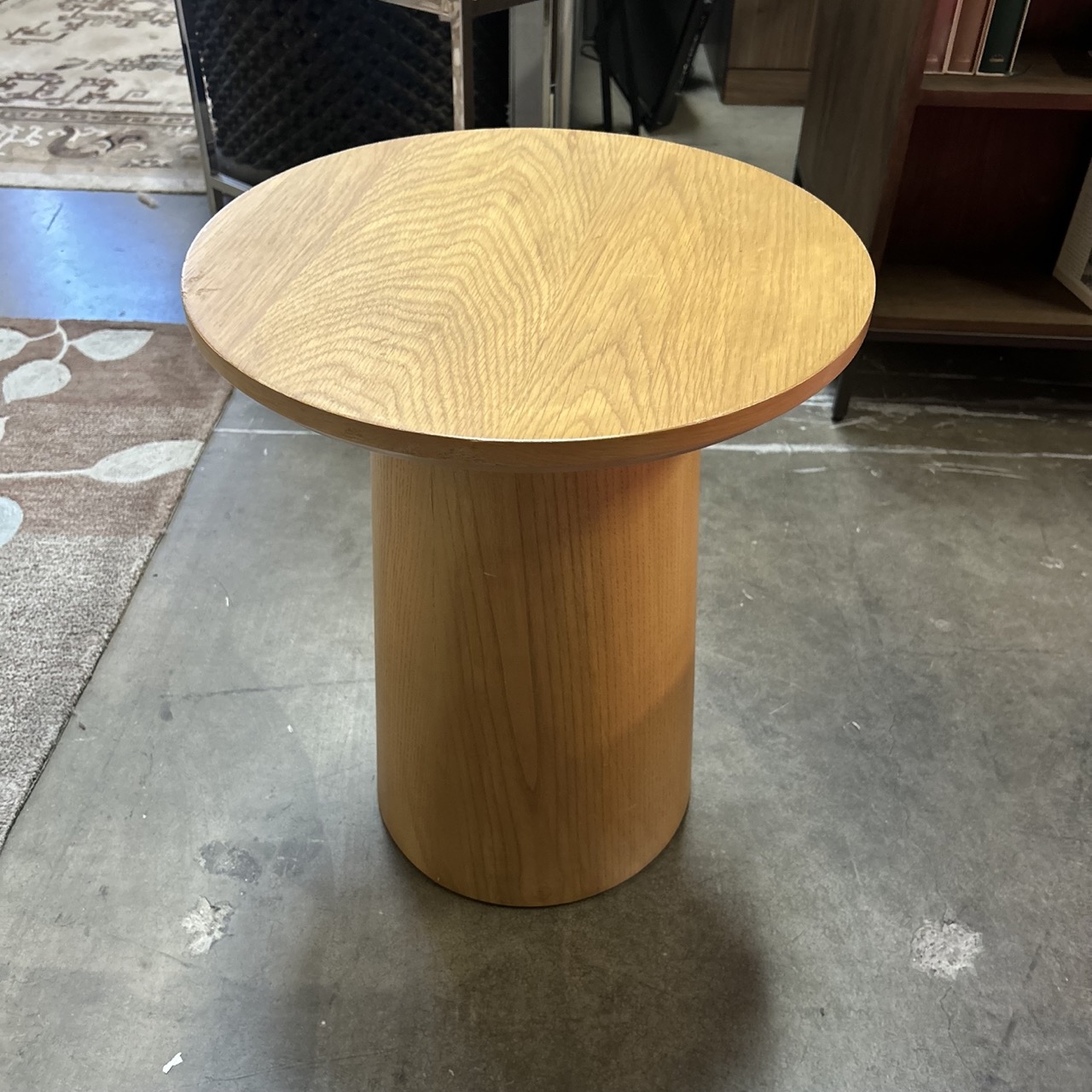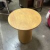 The drum form reads modern but timeless, making it an easy fit across mid-century, contemporary, and minimal interiors. The material warmth softens the geometry, while the single-column base keeps the profile clean from every angle. This is the kind of piece that quietly anchors a corner, holds a lamp or book stack with confidence, and feels owned rather than styled.