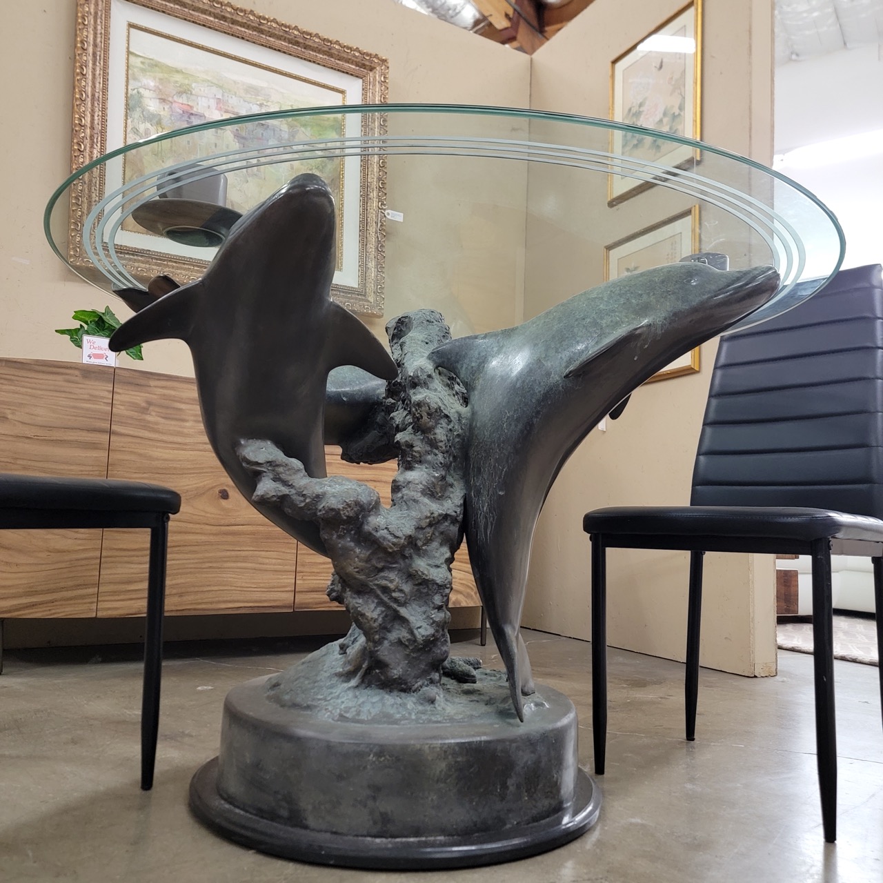 A thick round glass top floats over a dramatic pedestal base where three dolphins cut through a rising wave, finished in a bronze-tone, verdigris-style patina that gives it depth and movement from every angle. It lands best when you let it be the moment, pair it with clean, simple seating like lucite, white, or light wood chairs and keep the rest quiet.