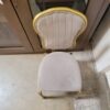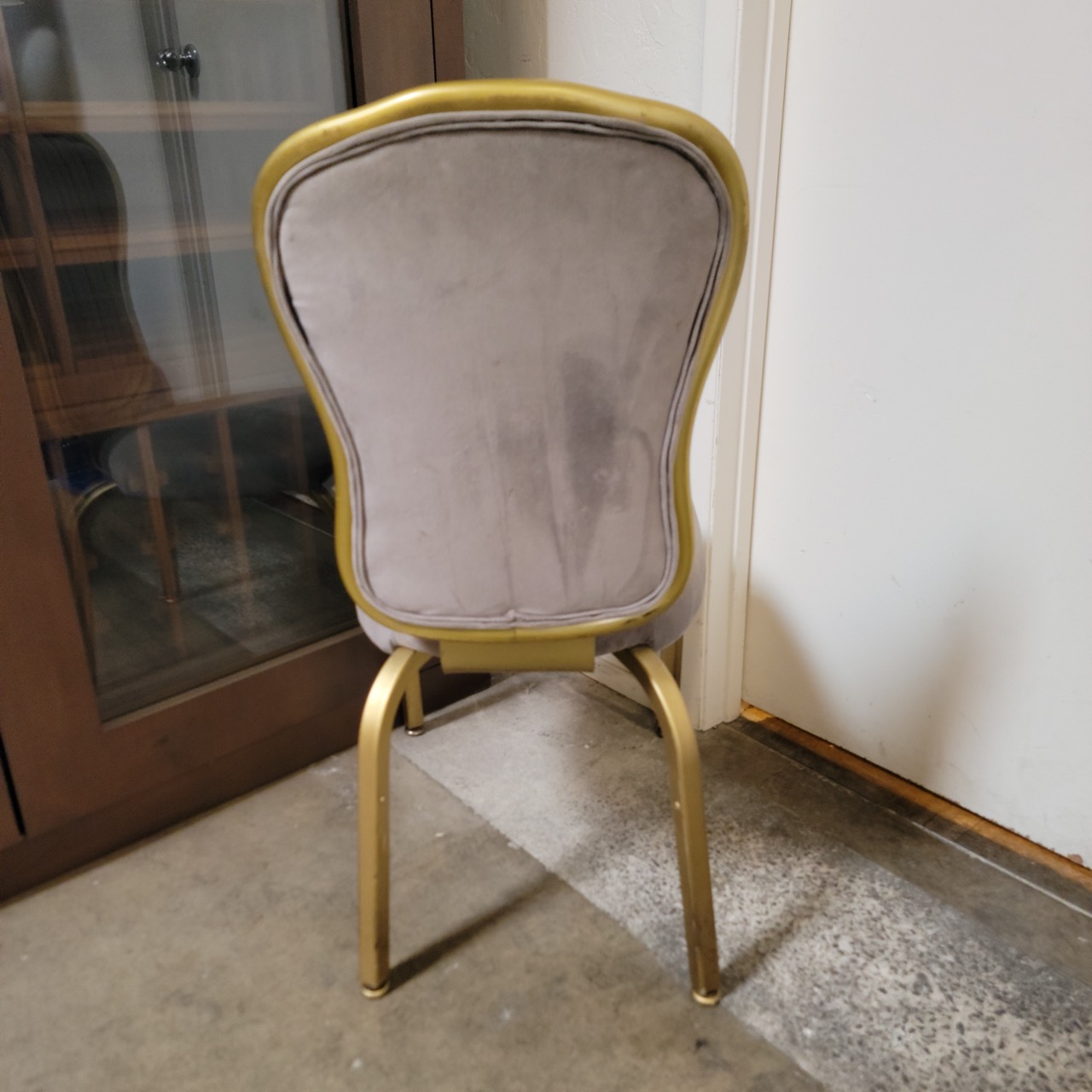 This set of six dining chairs pairs soft gray velvet upholstery with warm gold frames, creating a balanced look that feels both elevated and approachable. The curved back profile and subtle vertical channeling give each chair a sculpted presence without feeling heavy, allowing the set to sit comfortably in modern, transitional, or event-driven spaces.