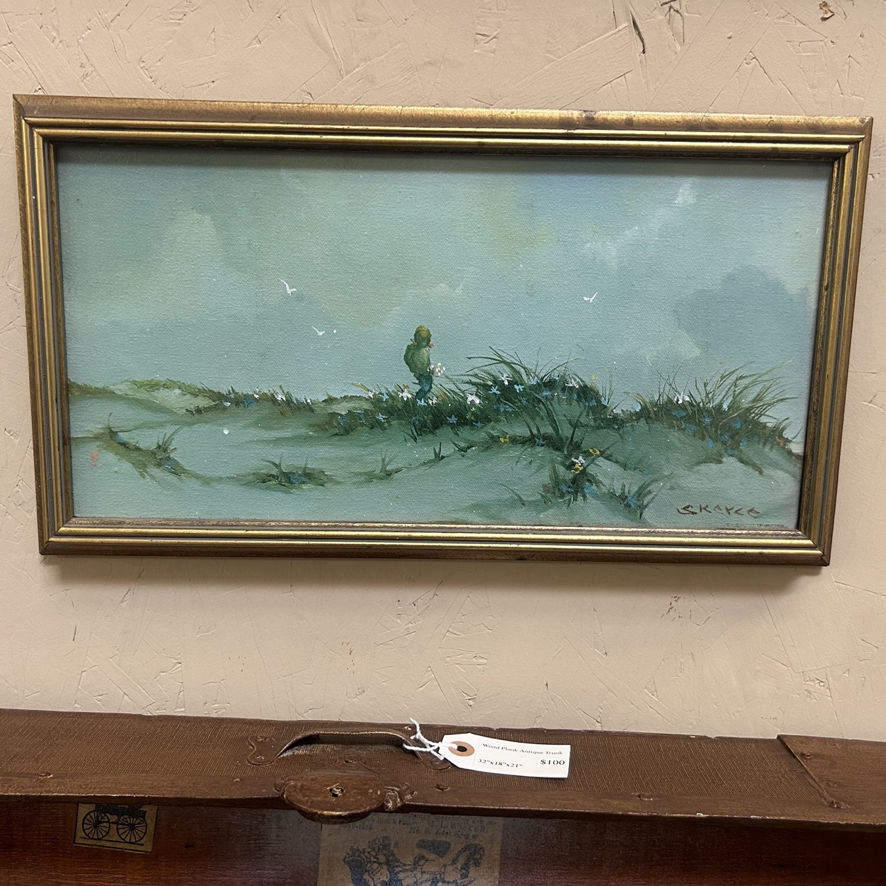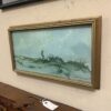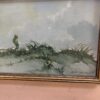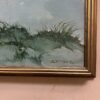Painted in oil on canvas, the work uses soft greens and pale sky tones to evoke a breezy shoreline scene. The piece is signed in the lower corner and housed in a traditional gold frame that complements the subtle palette.