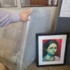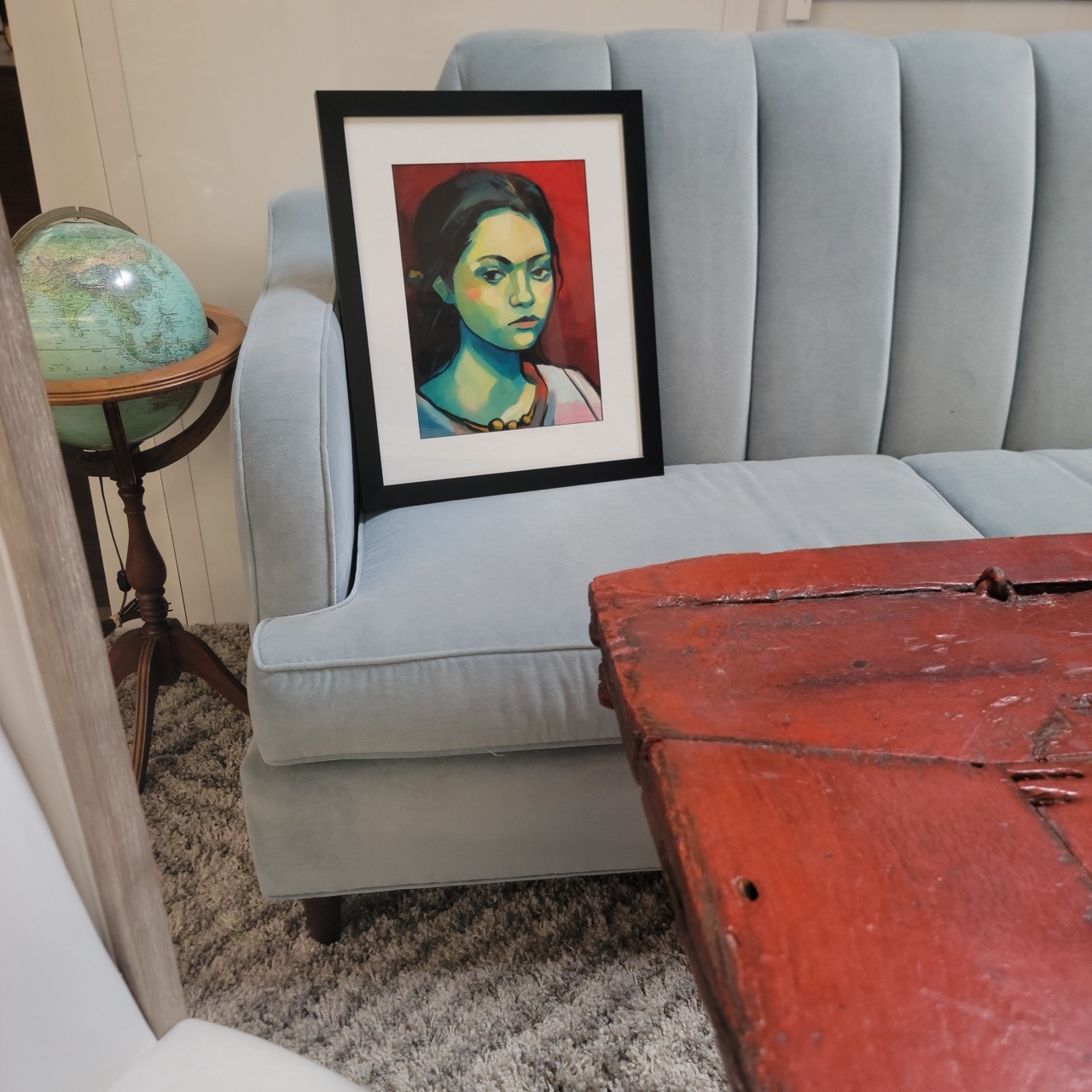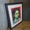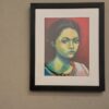This is a framed art print (not an original painting). Framed size is compact but impactful, great for layering into an art wall or adding a single strong face to a quiet corner. Framed portrait has gallery wire attached and is ready to hang.