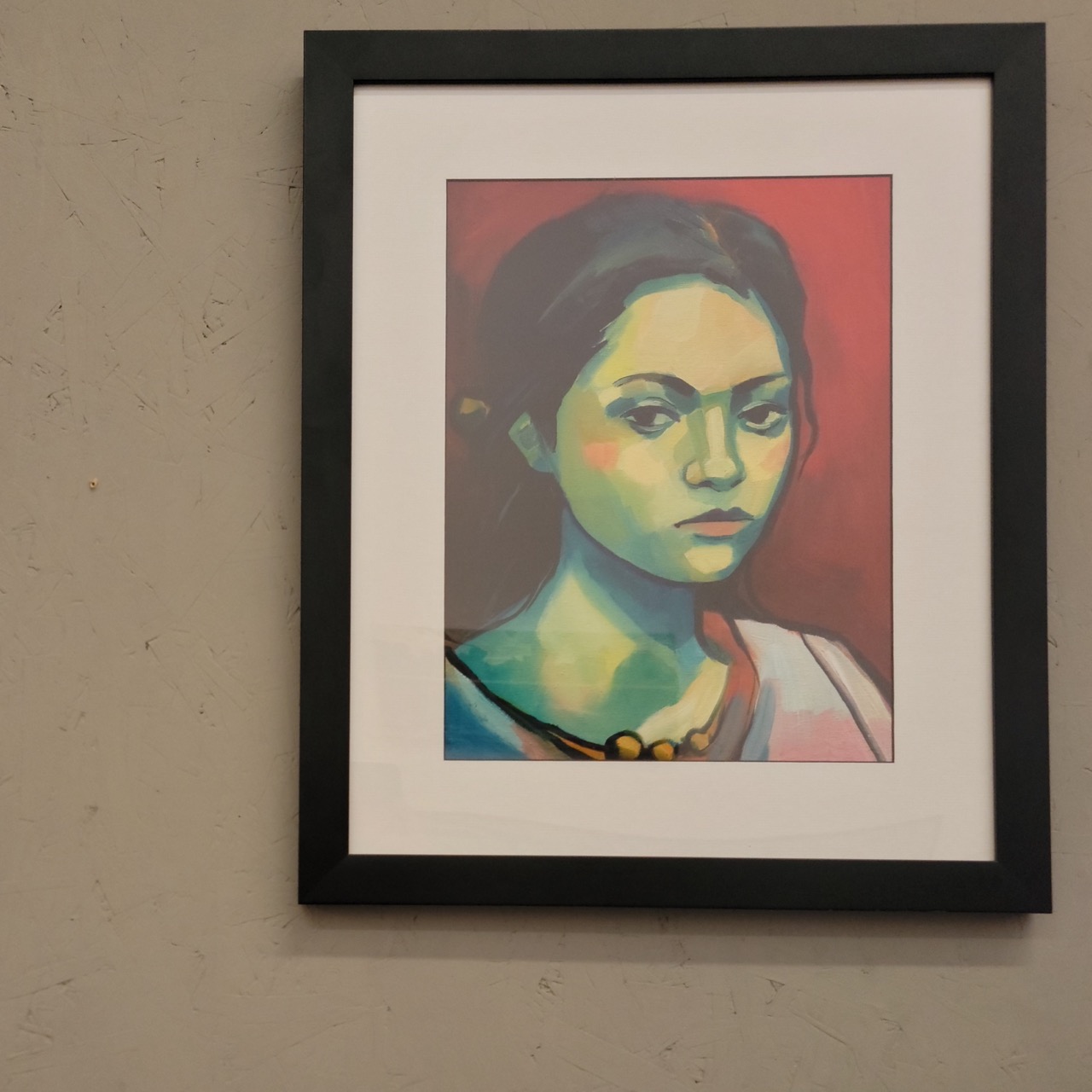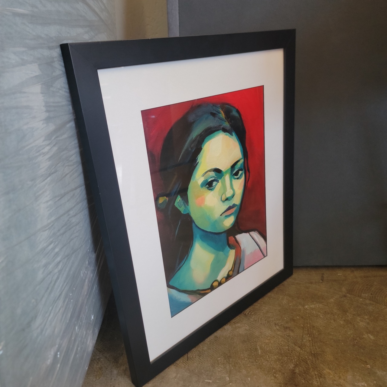 A punchy modern portrait that reads calm from across the room, then gets more interesting as you get closer, saturated reds, cool greens, and soft painterly transitions that feel contemporary without trying too hard. The black frame and wide white mat give it a finished, gallery-ready presence, so it looks intentional on a wall, or styled on a shelf until you pick the final spot.