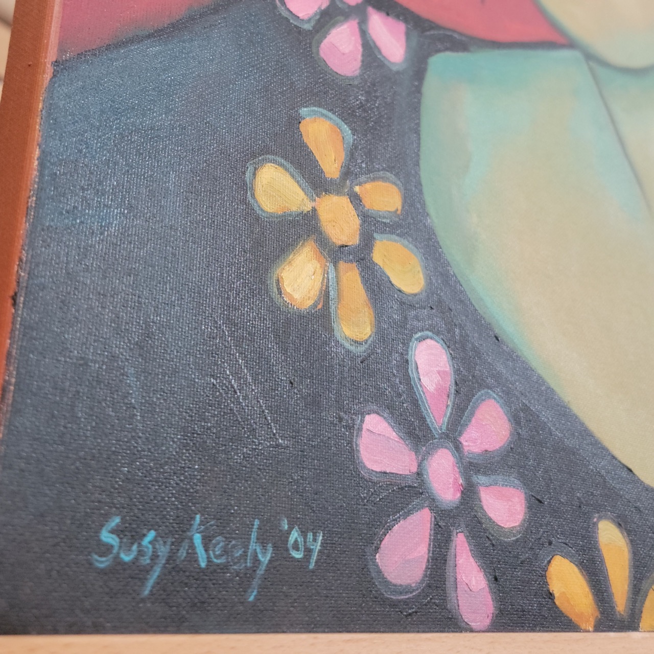 This original canvas by Susy Keely (signed 2004) leads with a steady expression and confident brushwork, then holds you with color, warm red ground, cool green tones, and floral accents that keep it contemporary without feeling trendy. Works well in an office, hallway, bedroom, or anywhere you want a single piece to set the tone without needing a frame. The canvas is 1 inch thick, so it can be displayed as-is, but note that there’s no gallery wire or hanging hardware currently installed. Easy add for the buyer.