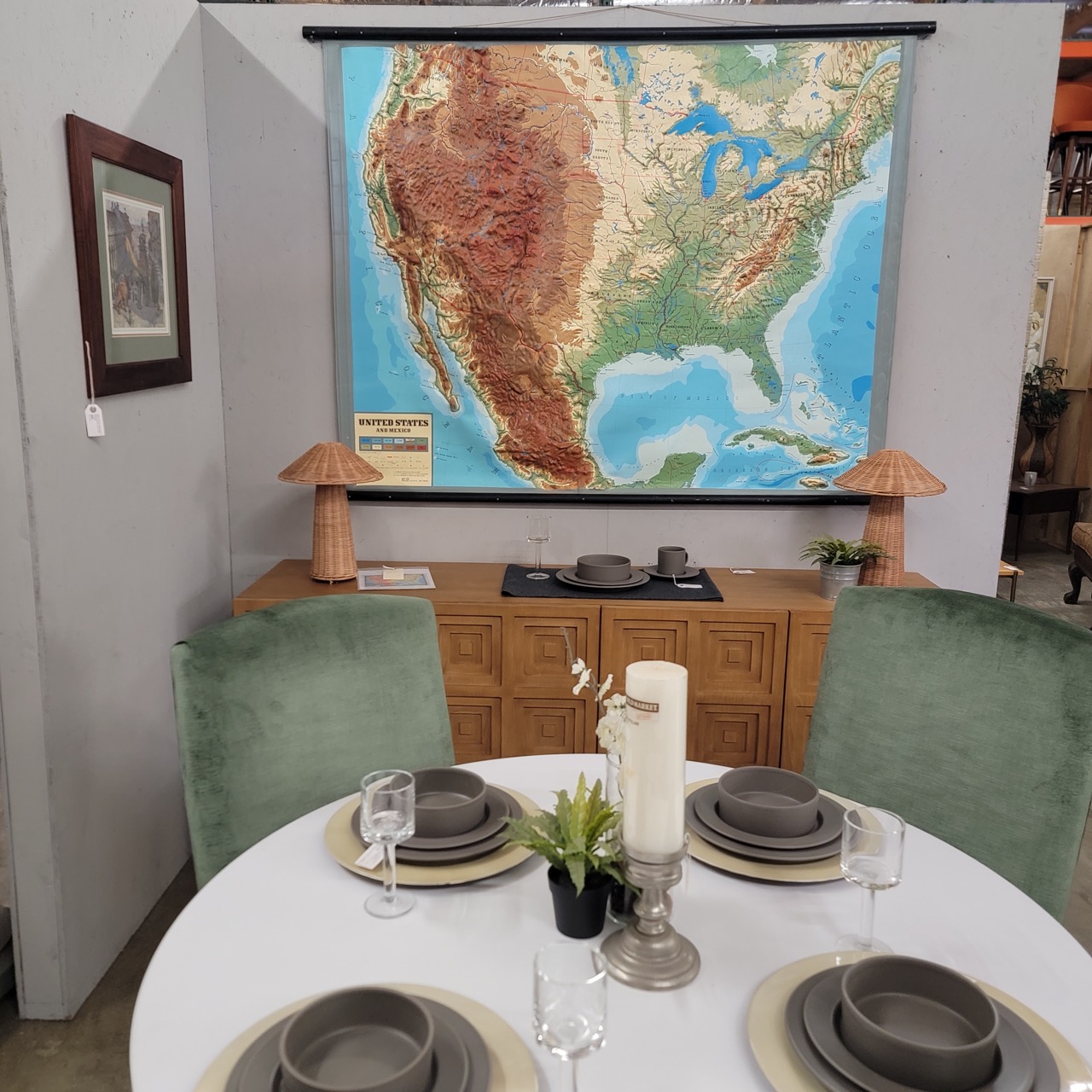 The oversized scale and sculpted surface create a dramatic presence in modern interiors, from home libraries and offices to trendy dining spaces and creative studios. Its original, mid-century design language offers a collector-grade balance of bold colors, archival graphics, and tactile geography.