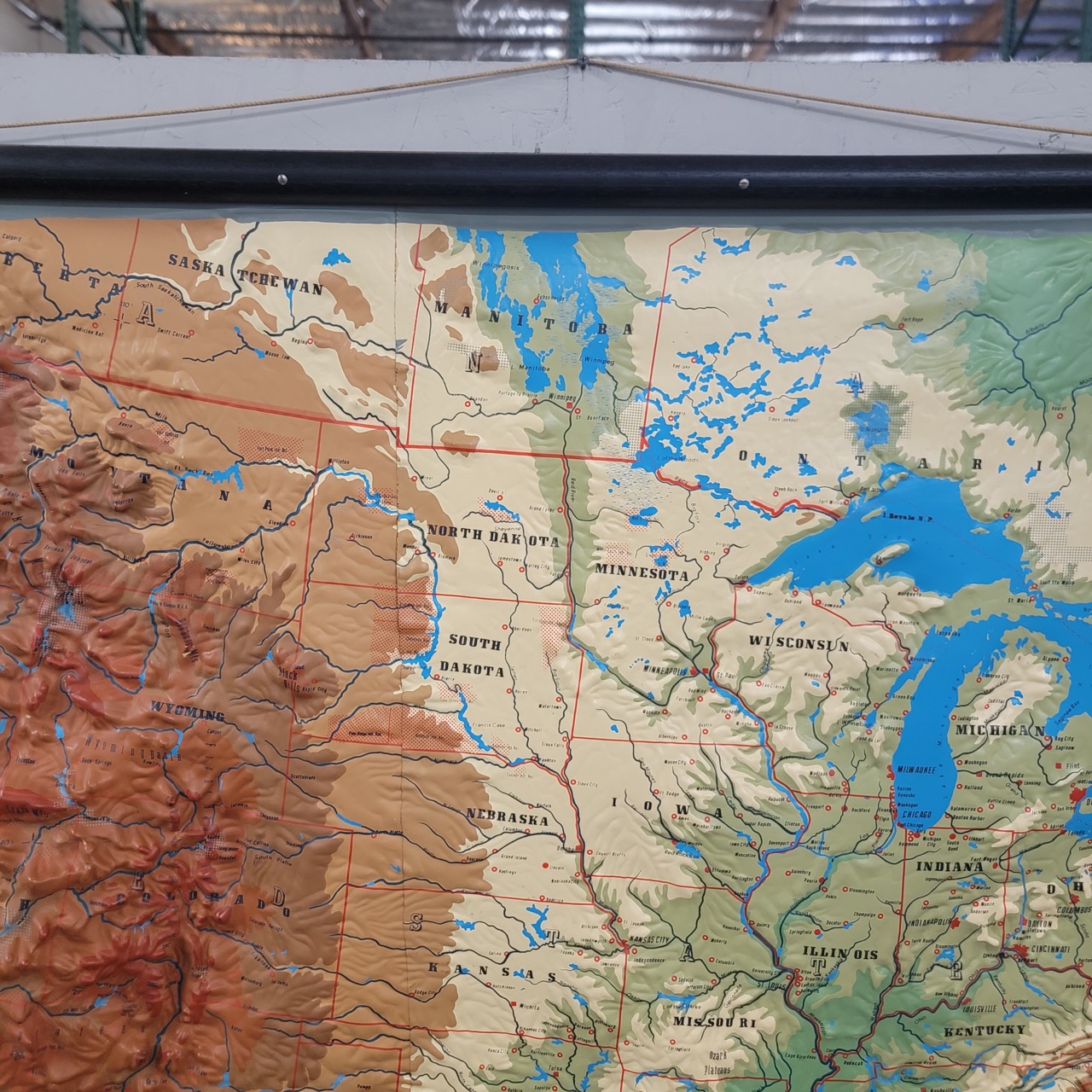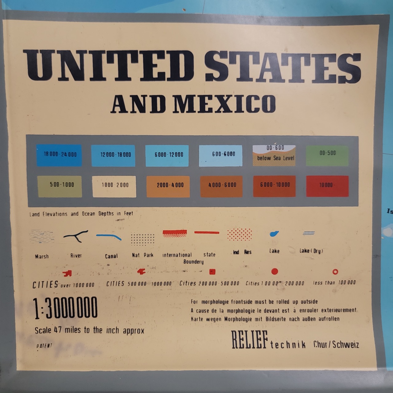 Bring depth, dimension, and discovery to your wall with this impressive six-foot Swiss-made relief map showcasing the United States and Mexico. Crafted using RELIEF technik in Chur, Switzerland, this piece features rubberized, three-dimensional terrain highlighting major mountain ranges, waterways, and cities across North America.
