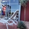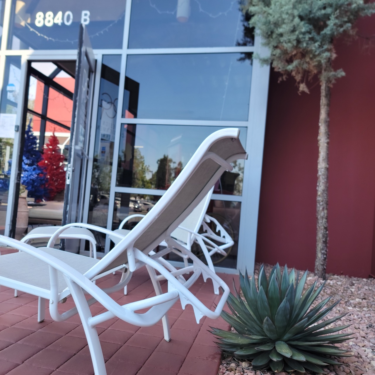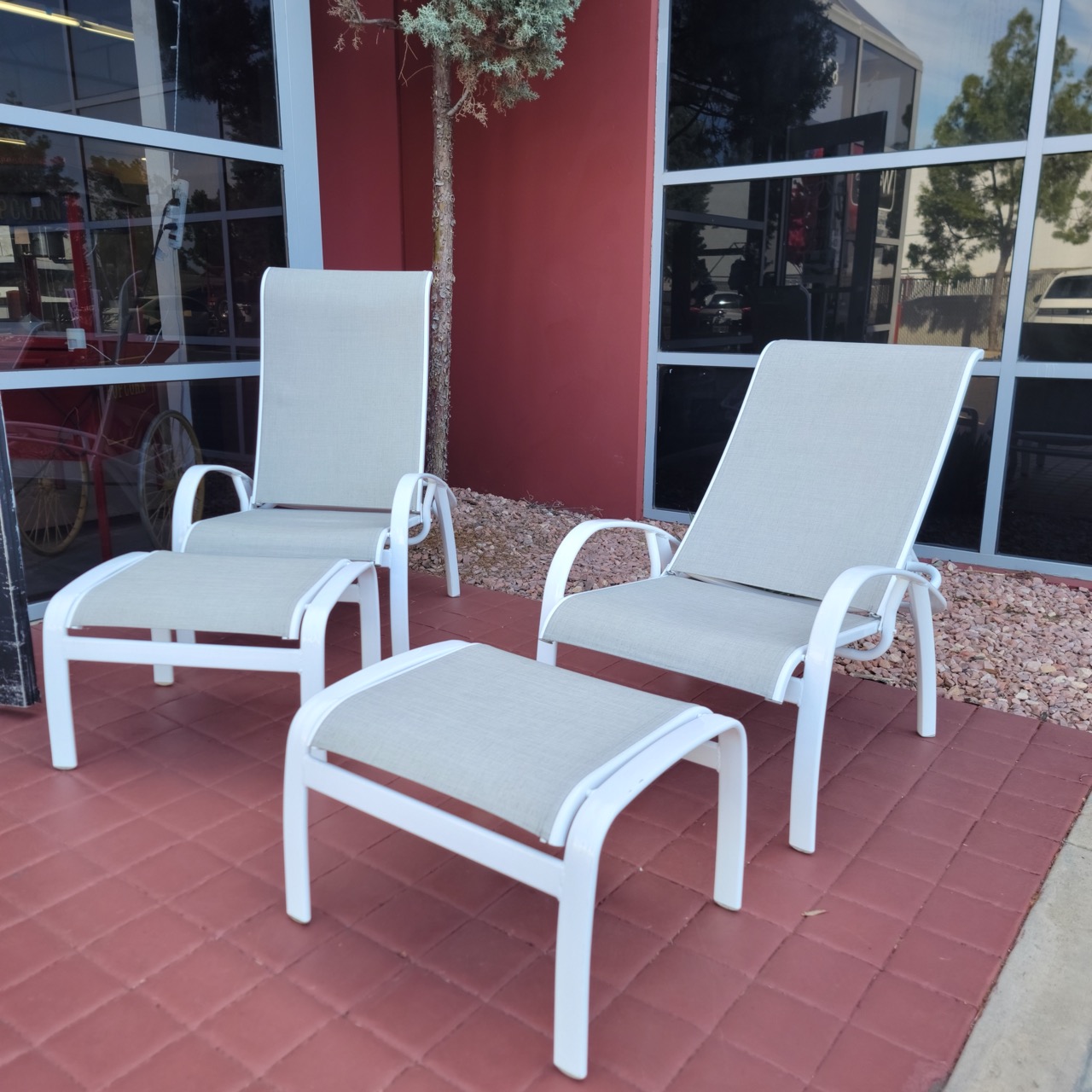 These Tropitone sling recliner chairs pair crisp white frames with light neutral sling upholstery for a look that feels clean, practical, and quietly resort-like without being fussy. The lines are simple and architectural, and the matching ottomans give the set a more finished, lounge-ready feel. They work well where you want comfort and visual calm without adding bulk.