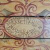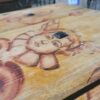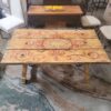 This table leads with surface and story. The hand-painted top carries scrolling motifs, symbolic figures, and worn color that feel closer to an old refectory table than a modern reproduction. It reads warm, informal, and lived-in, the kind of piece that sets the tone for a room rather than disappearing into it.