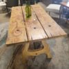 Constructed in solid wood with a trestle base and shaped legs. The top is made from wide planks, joined with visible seams and accented by small square metal details set into the surface. Painted decoration shows intentional wear, fading, and patina throughout. This is cosmetic and consistent with the style, not damage. Expect variation, surface marks, and age character rather than a uniform finish. Structurally solid and ready for daily use as a dining table, kitchen table, or creative workspace.