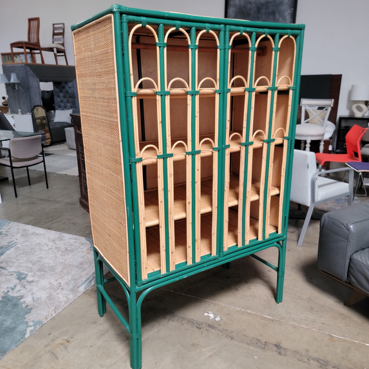 This one does not read like ordinary storage. The green bamboo frame gives it shape, the repeating arch pattern keeps the front lively, and the woven surfaces soften the whole piece.