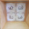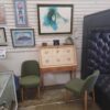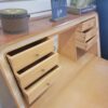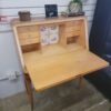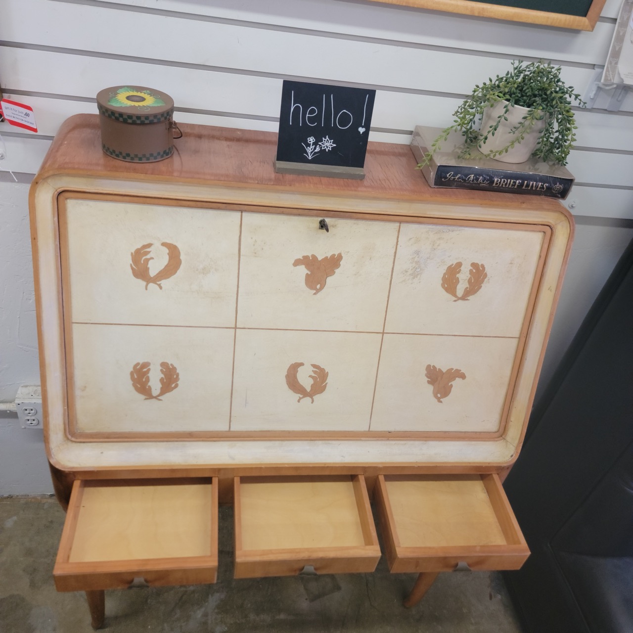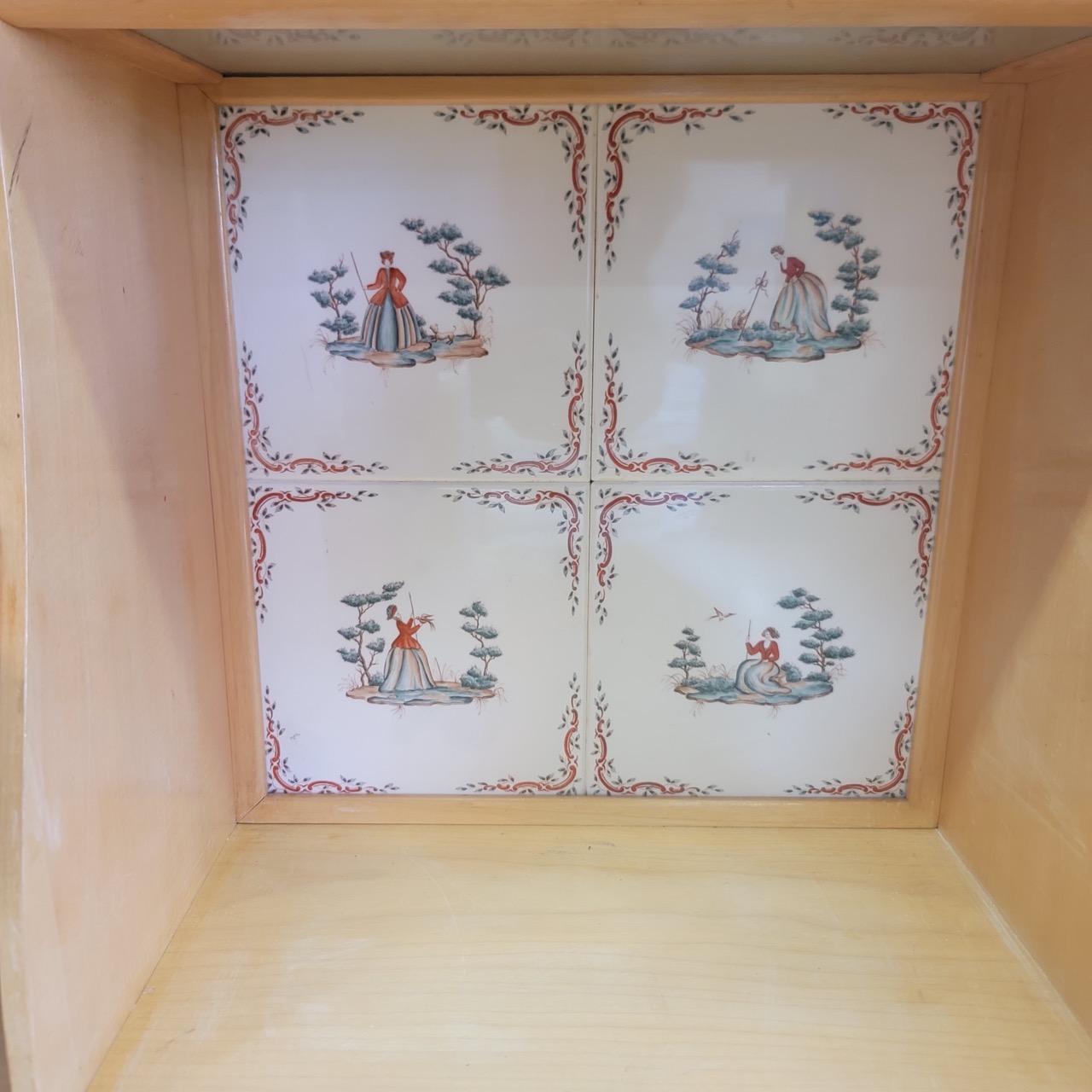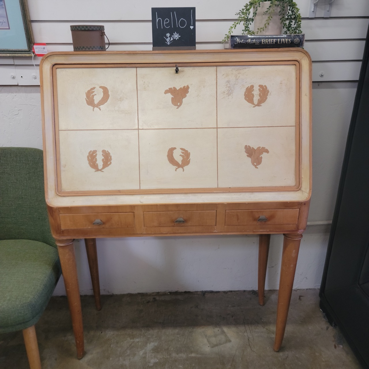 Elegant Milanese craftsmanship with playful detail. This 1950s, 60s drop front writing desk features a softly radiused case, slender legs, and a paneled fall-front that opens to a charming interior, complete with four hand-painted ceramic tiles and fitted storage. The layout is practical, six small interior drawers and open cubbies keep stationery organized, while three exterior drawers handle everyday essentials. The finish shows sunning, scuffs, and touch marks that read as authentic patina for its age. The lock cylinder does not function and the desk stays in the unlocked position. Includes display key. Clean inside. Ready to place and enjoy.
